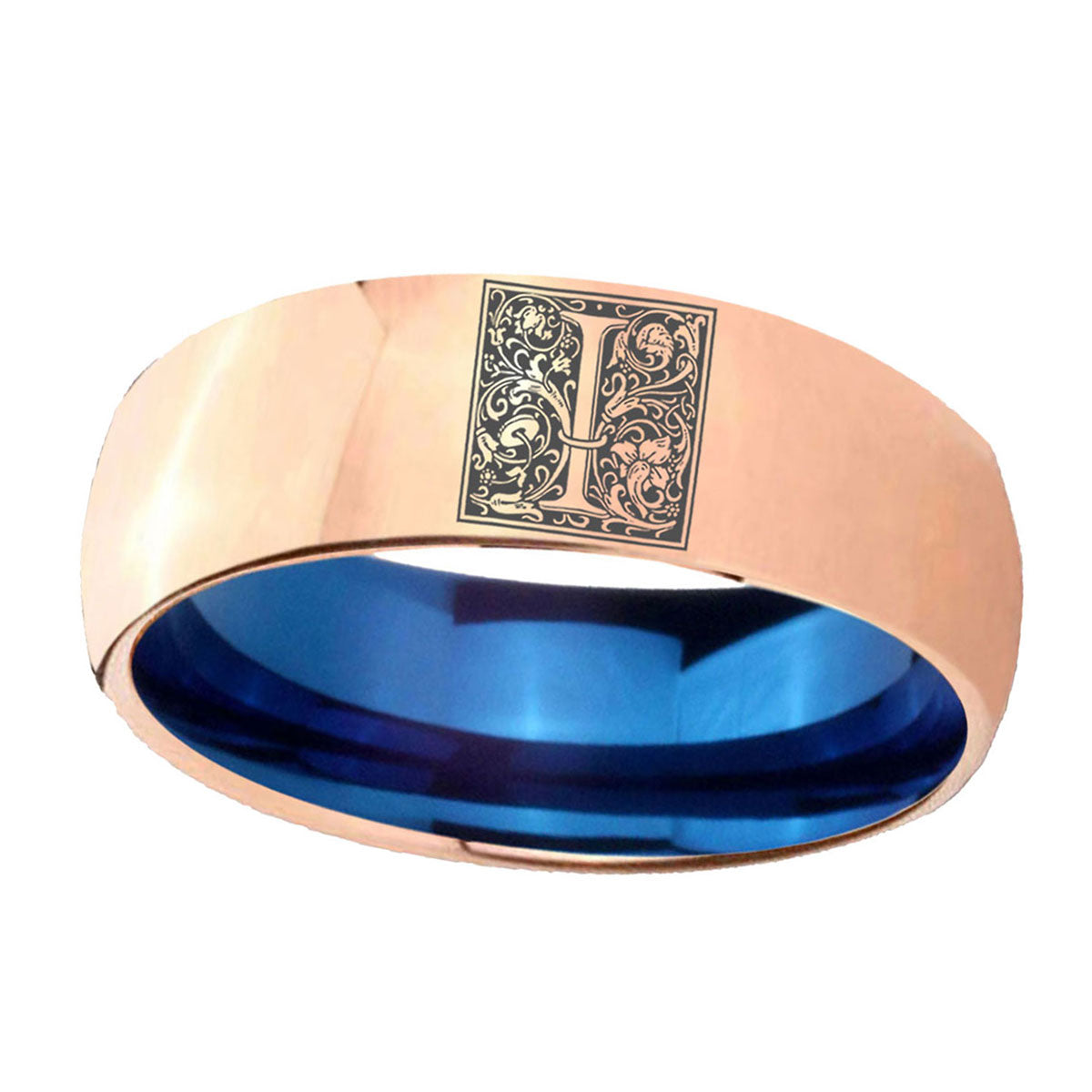 This classic dome tungsten carbide ring in rose gold and blue color with Monogram Floral Initial Letter I engraved on it.