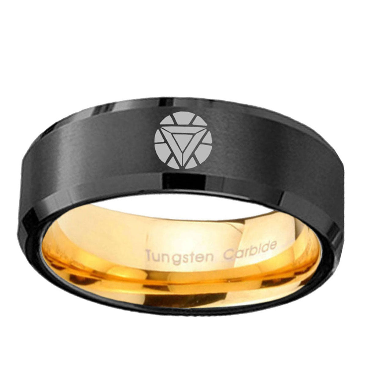 Introuding 8mm Iron Man Art Reactor Beveled Edge Gold Black Men's Rings Tungsten . Offer in 8mm band width black and gold plated finished from size 7 to 14