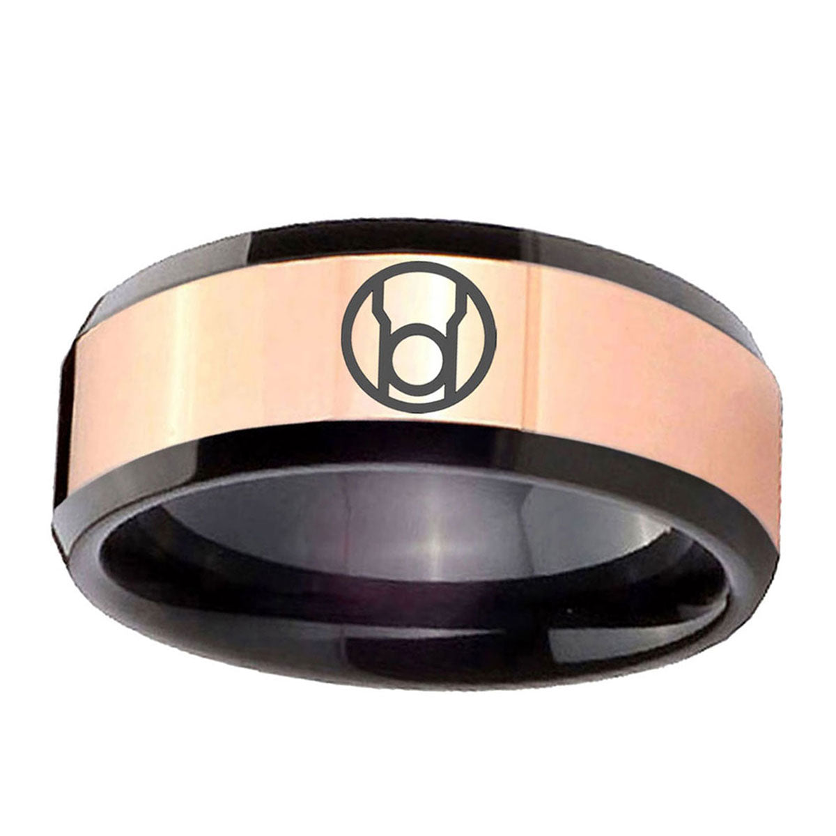 Introuding 8mm Red Lantern Beveled Edge Black Rose Gold Tungsten Male Wedding Rings . Offer in 8mm band width rose gold and black plated finished from size 7 to 14