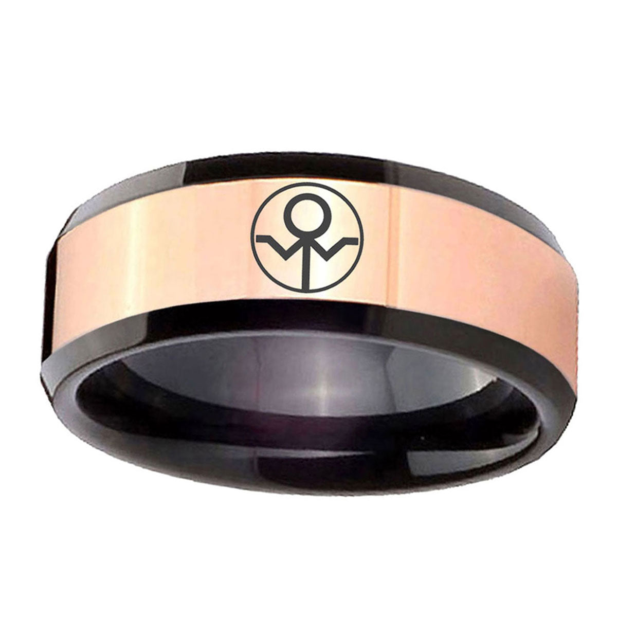 Introuding 8mm Gray Lantern Beveled Edge Black Rose Gold Tungsten Male Wedding Rings . Offer in 8mm band width rose gold and black plated finished from size 7 to 14