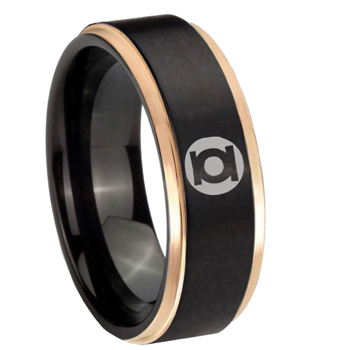 Introuding 6, 8mm Green Lantern Step Edge Black Rose Gold Custom Engraved Wedding Bands . Offer in 6mm and 8mm band width rose gold and black plated finished from size 4 to 14