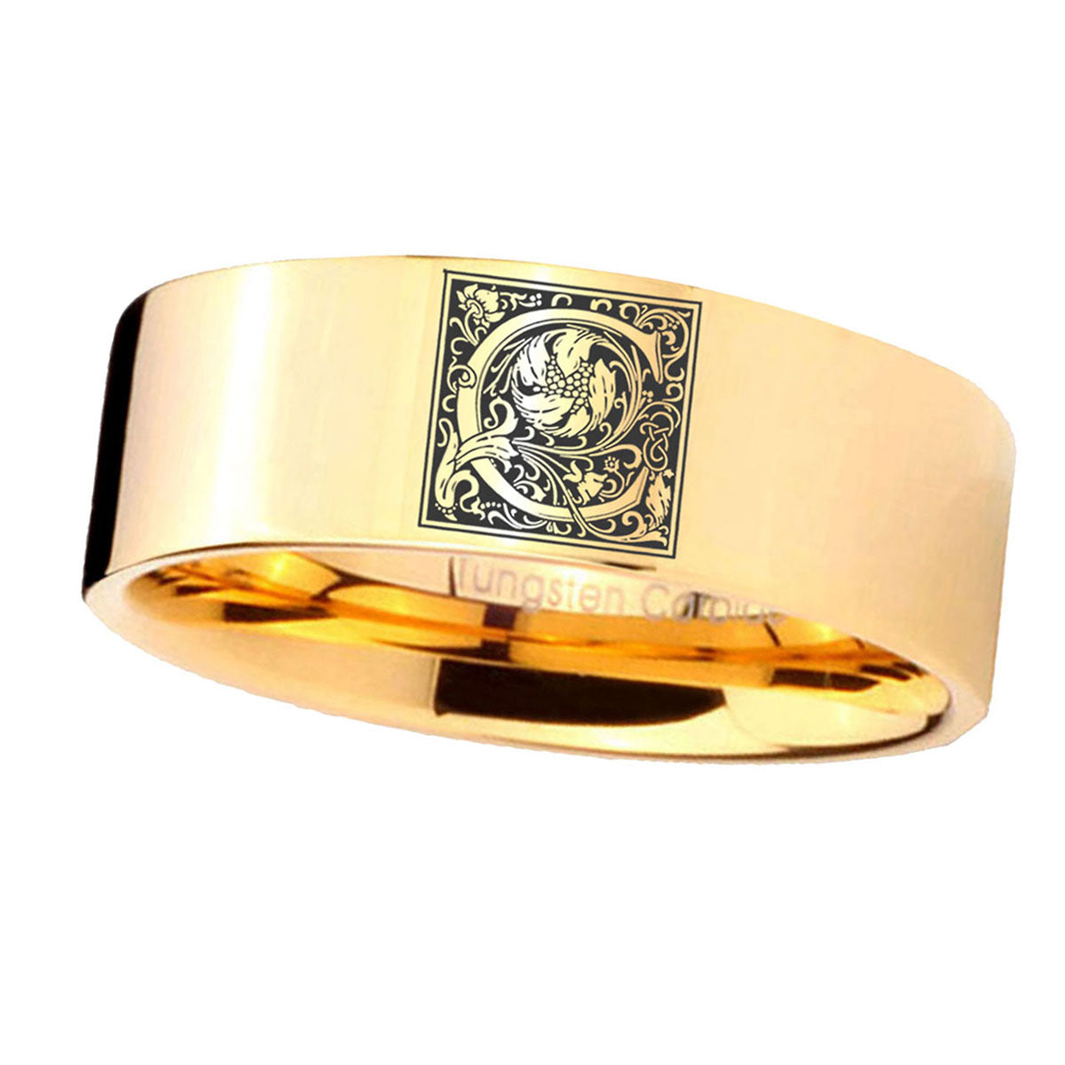 8mm Pipe Cut Gold Tungsten Floral Initial Letter C, Monogram Ring
