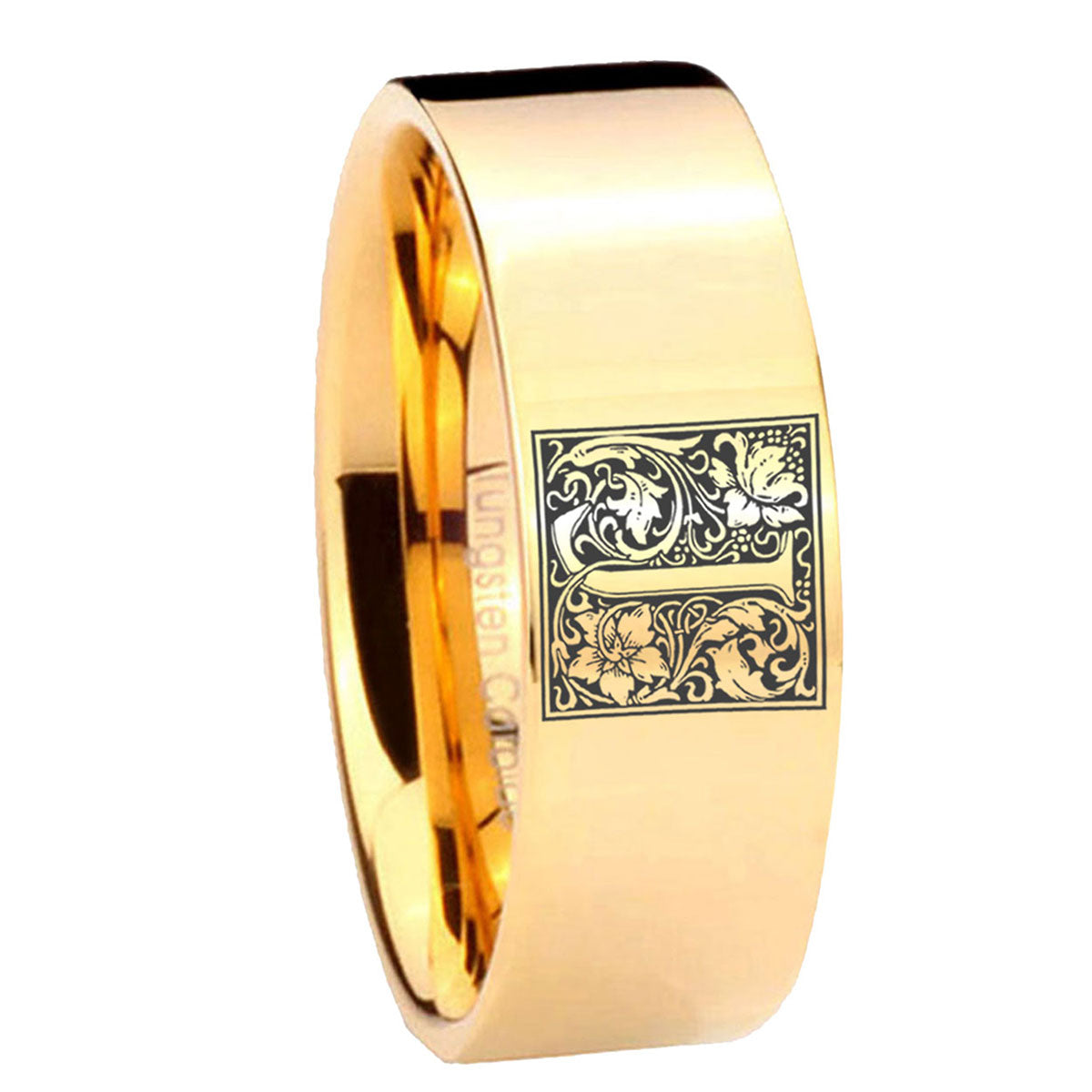 8mm Pipe Cut Gold Tungsten Floral Initial Letter J, Monogram Ring