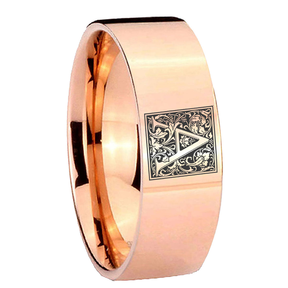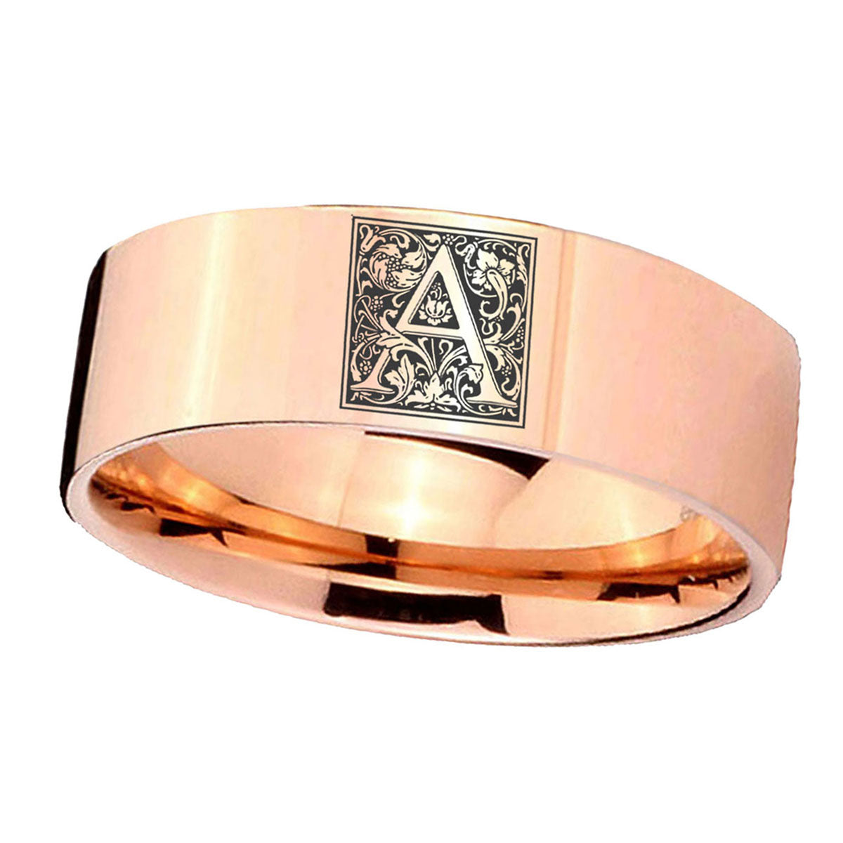 8mm Pipe Cut Rose Gold Tungsten Floral Initial Letter A, Monogram Wedding Ring