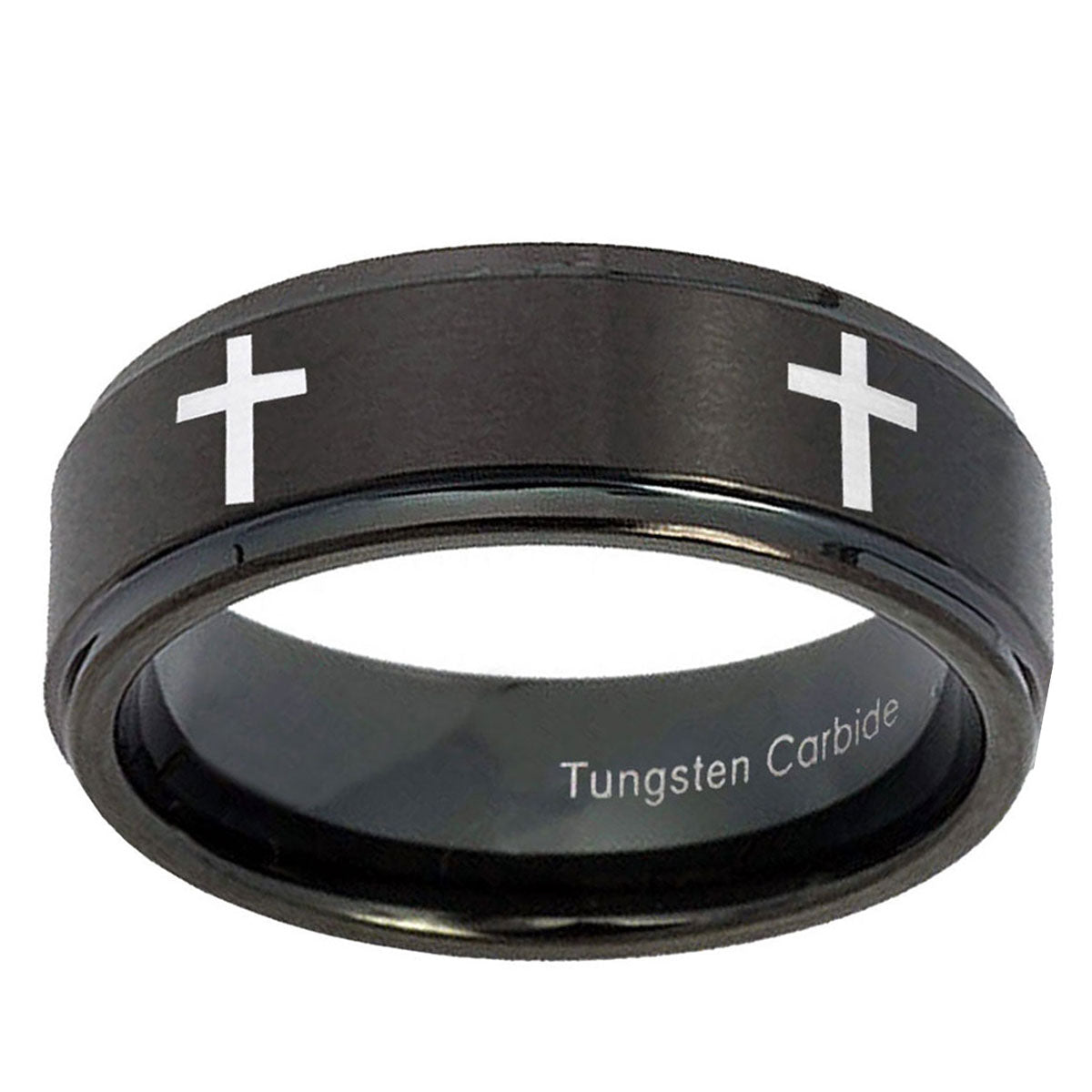 Propose with the 10mm Crosses Step Edges Brush Black Tungsten Carbide Mens Engagement Band. This brushed black ring with step edges and Crosses design is ideal for engagements.