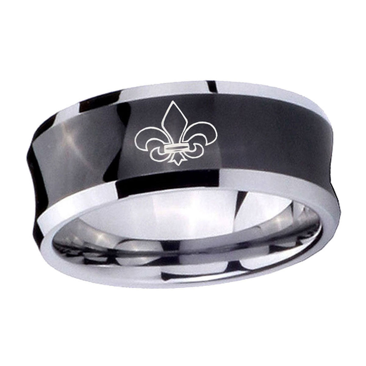 Introuding 5, 8mm Fleur De Lis Concave Black Tungsten Carbide Custom Ring for Men . Offer in both 5mm and 8mm band width black plated two tone finished from size 4 to 14