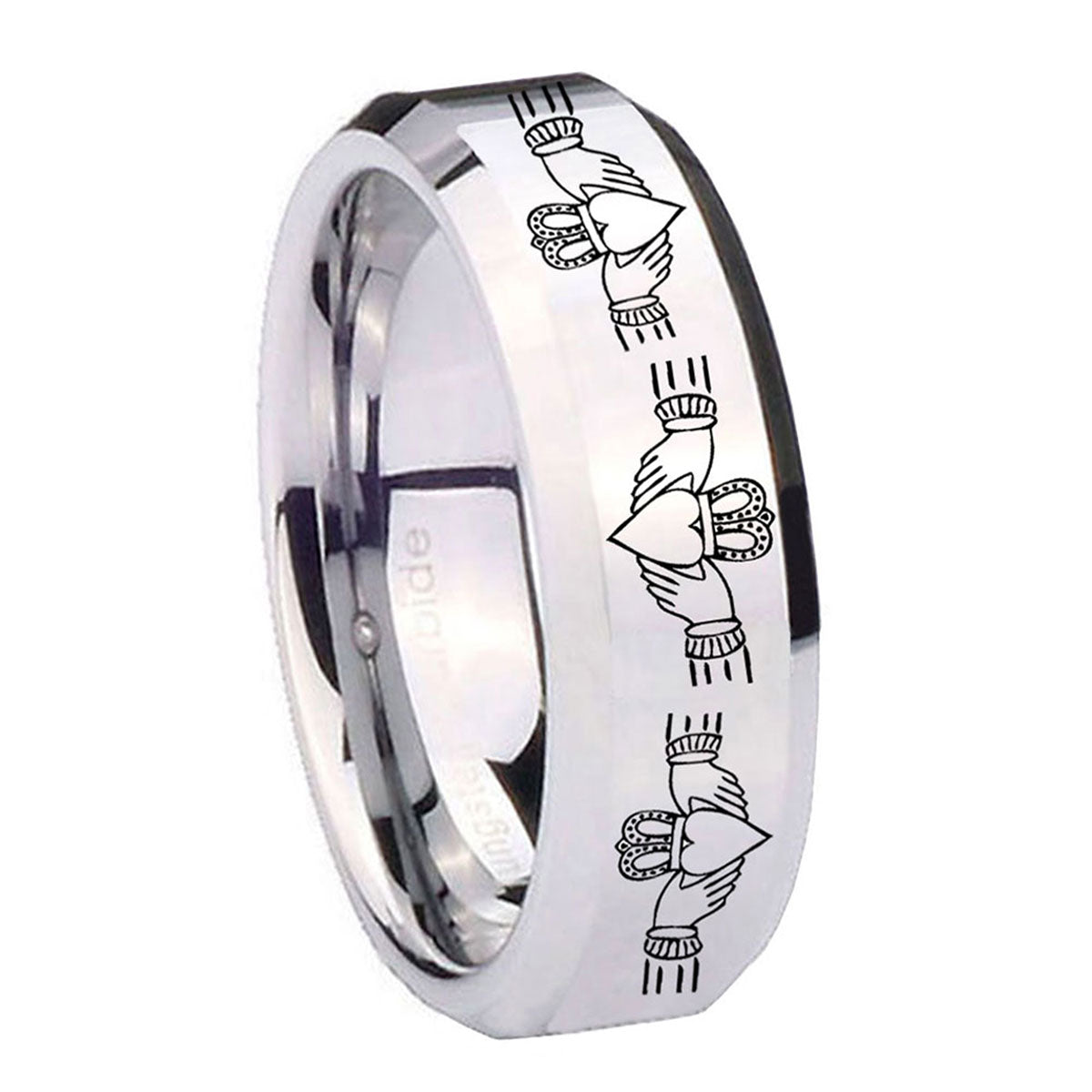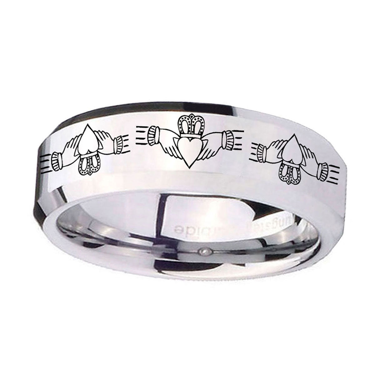 10mm Irish Claddagh Beveled Edges Silver Tungsten Carbide Mens Ring
