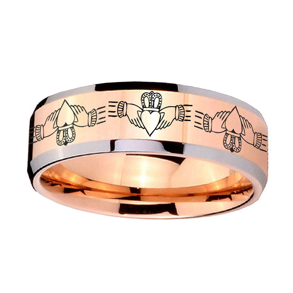 10mm Irish Claddagh Beveled Edges Rose Gold Tungsten Carbide Rings for Men