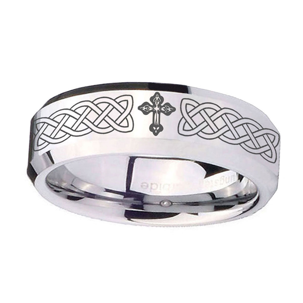 Celebrate milestones with the 10mm Celtic Cross Beveled Edges Silver Tungsten Carbide Mens Anniversary Ring. This silver tungsten ring with Celtic cross design is perfect for anniversaries.