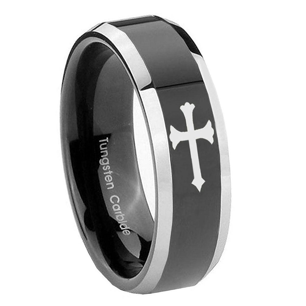 10mm Christian Cross Beveled Edges Glossy Black 2 Tone Tungsten Men's Band Ring