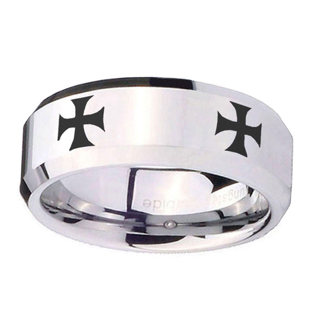 Introuding 5, 8mm 4 Maltese Cross Beveled Edges Silver Tungsten Carbide Men's Band Ring . Offer in both 5mm and 8mm band width polished silver fnished from size 4 to 14