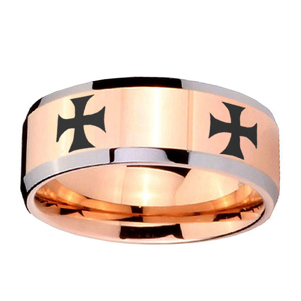 10mm 4 Maltese Cross Beveled Edges Rose Gold Tungsten Men's Wedding Ring