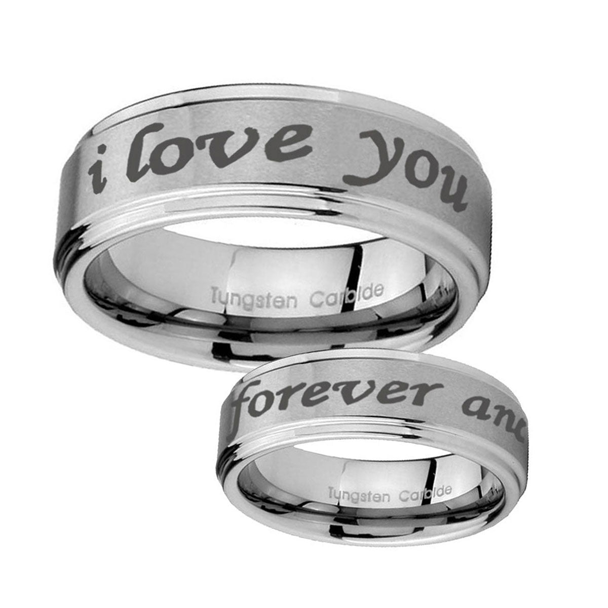 Introuding 5, 8mm I Love You Forever and ever Step Edges Brushed Tungsten Mens Engagement Band . Offer in both 5mm and 8mm band width brushed grey fnished from size 4 to 14