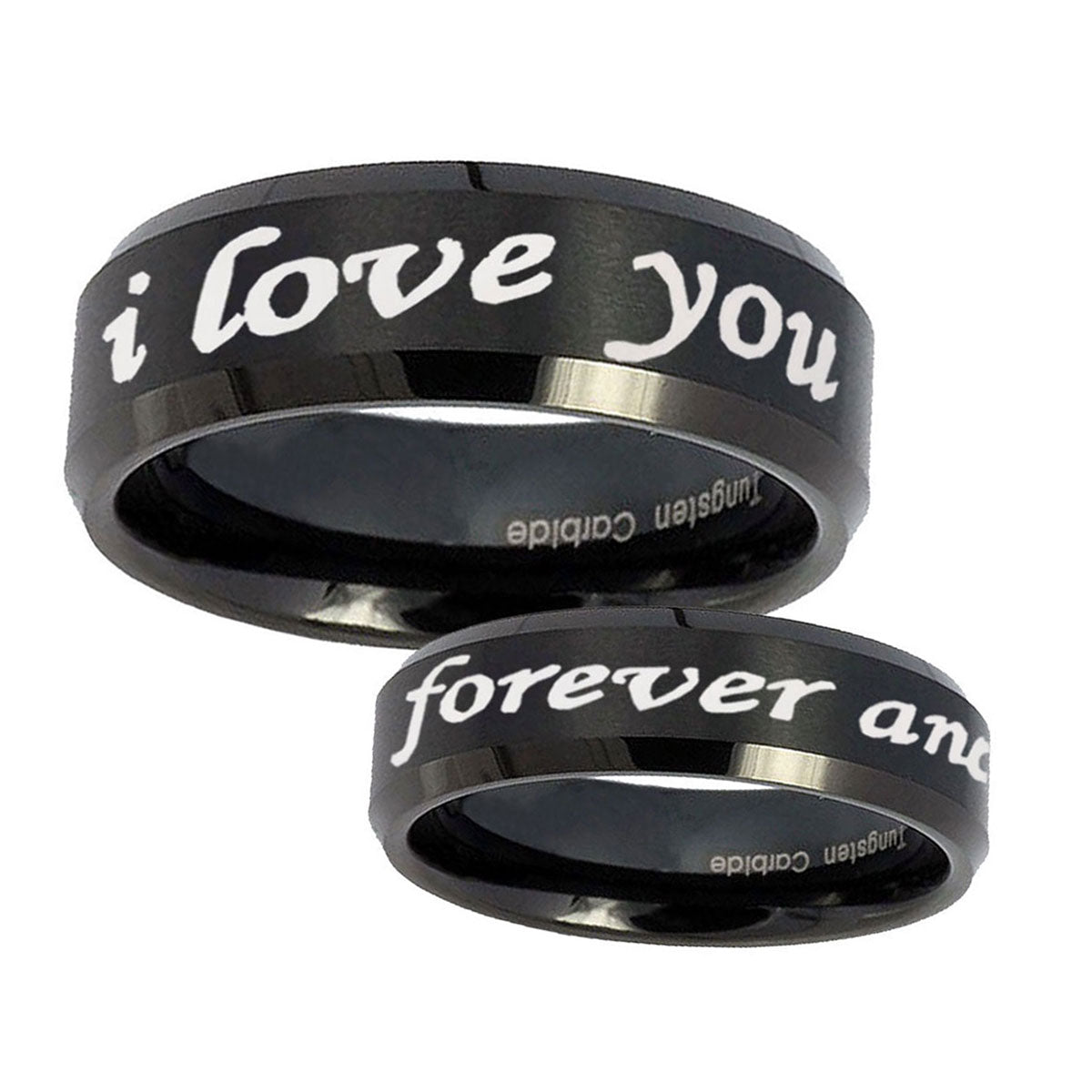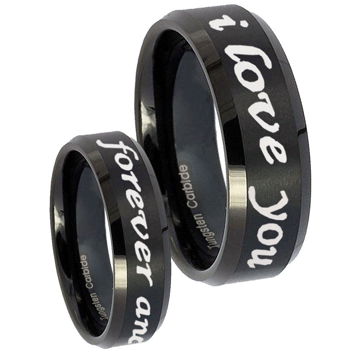 Introuding 5, 8mm I Love You Forever and ever Beveled Edges Brush Black Tungsten Mens Ring . Offer in both 5mm and 8mm band width brushed black plated fnished from size 4 to 14