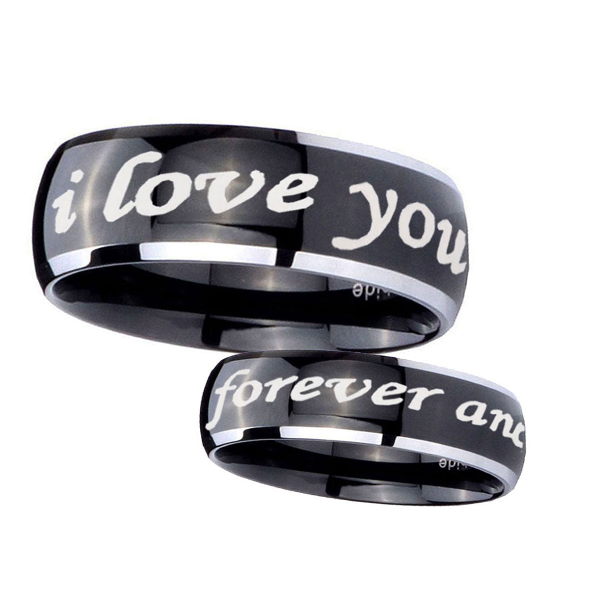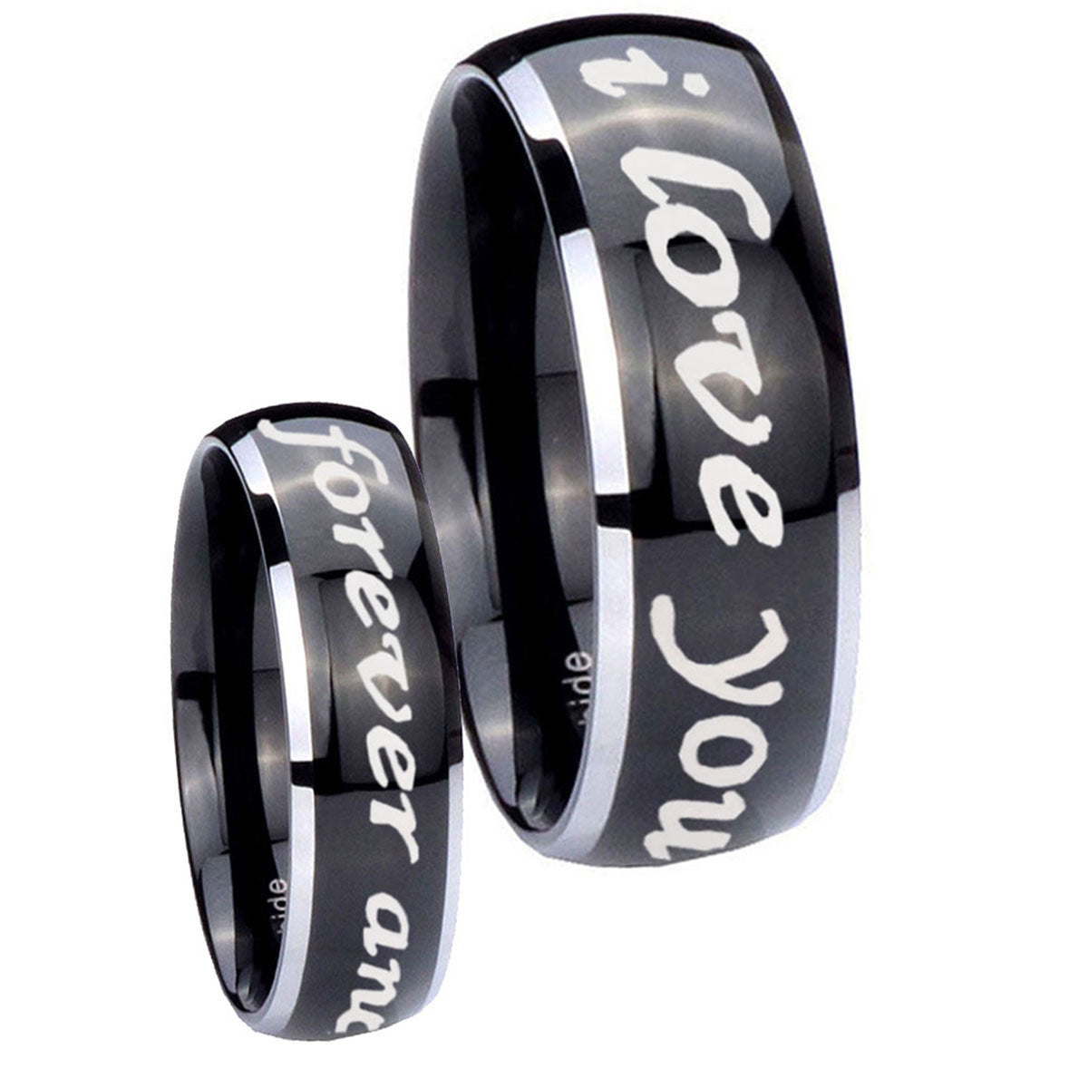Personalize the 10mm I Love You Forever and ever Dome Glossy Black 2 Tone Tungsten Engraved Ring. This glossy black and 2-tone dome ring with I Love You Forever design is perfect for custom engravings.
