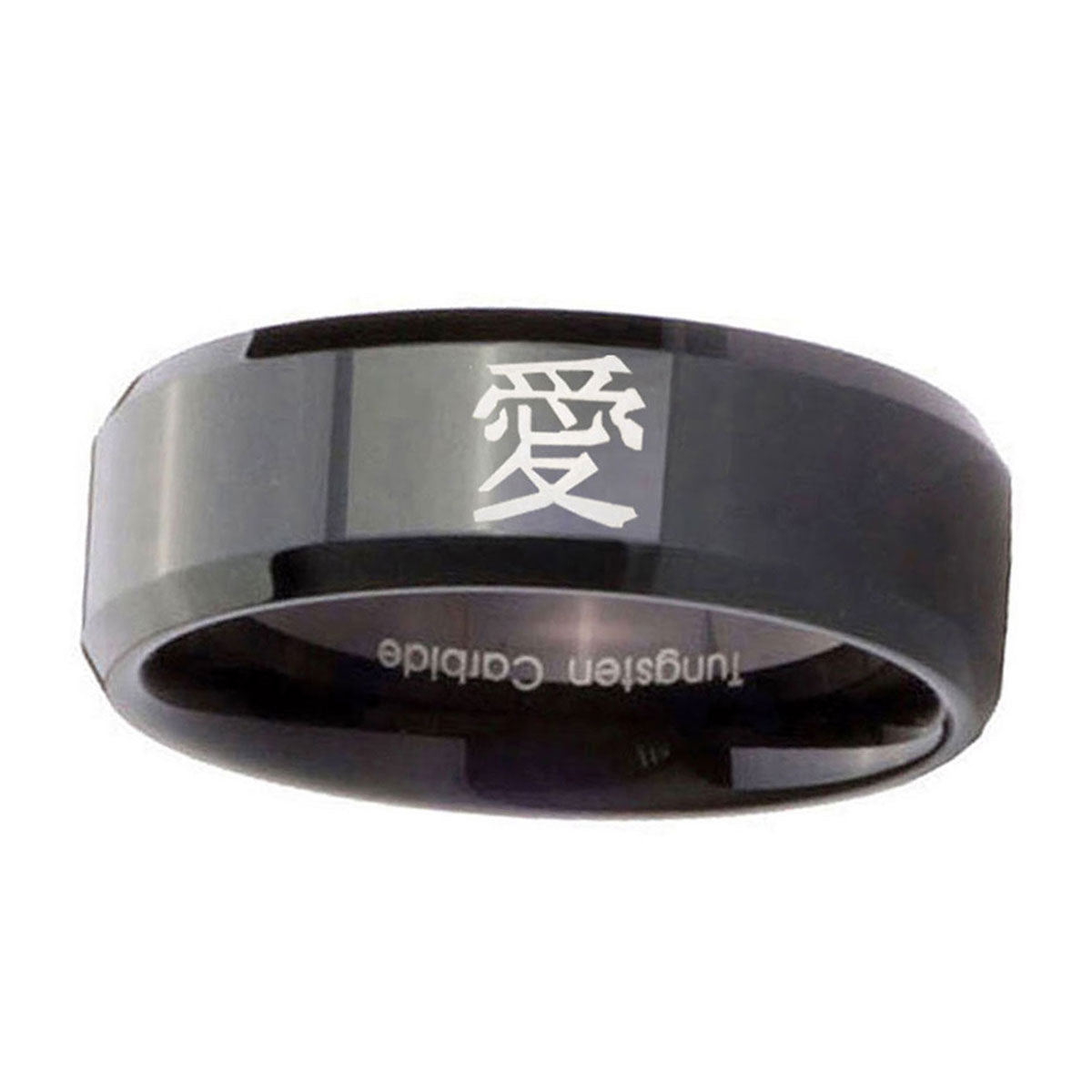 10mm Kanji Love Beveled Edges Black Tungsten Carbide Mens Promise Ring