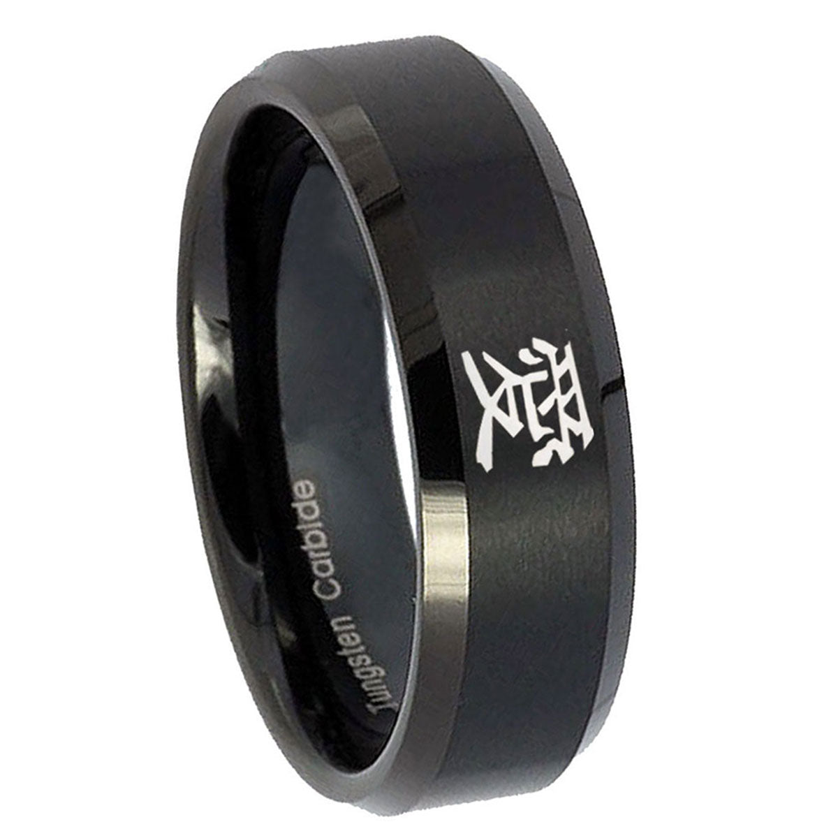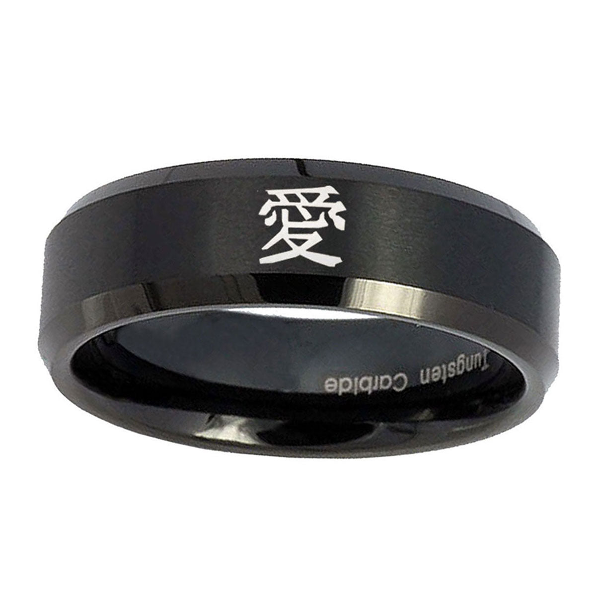 Personalize the 10mm Kanji Love Beveled Edges Brush Black Tungsten Carbide Mens Ring Engraved. This brushed black tungsten ring with Kanji Love design is perfect for custom engravings.