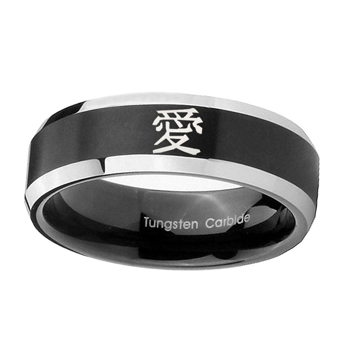 5, 8mm Kanji Love Beveled Edges Brush Black 2 Tone Tungsten Wedding Engraving Ring