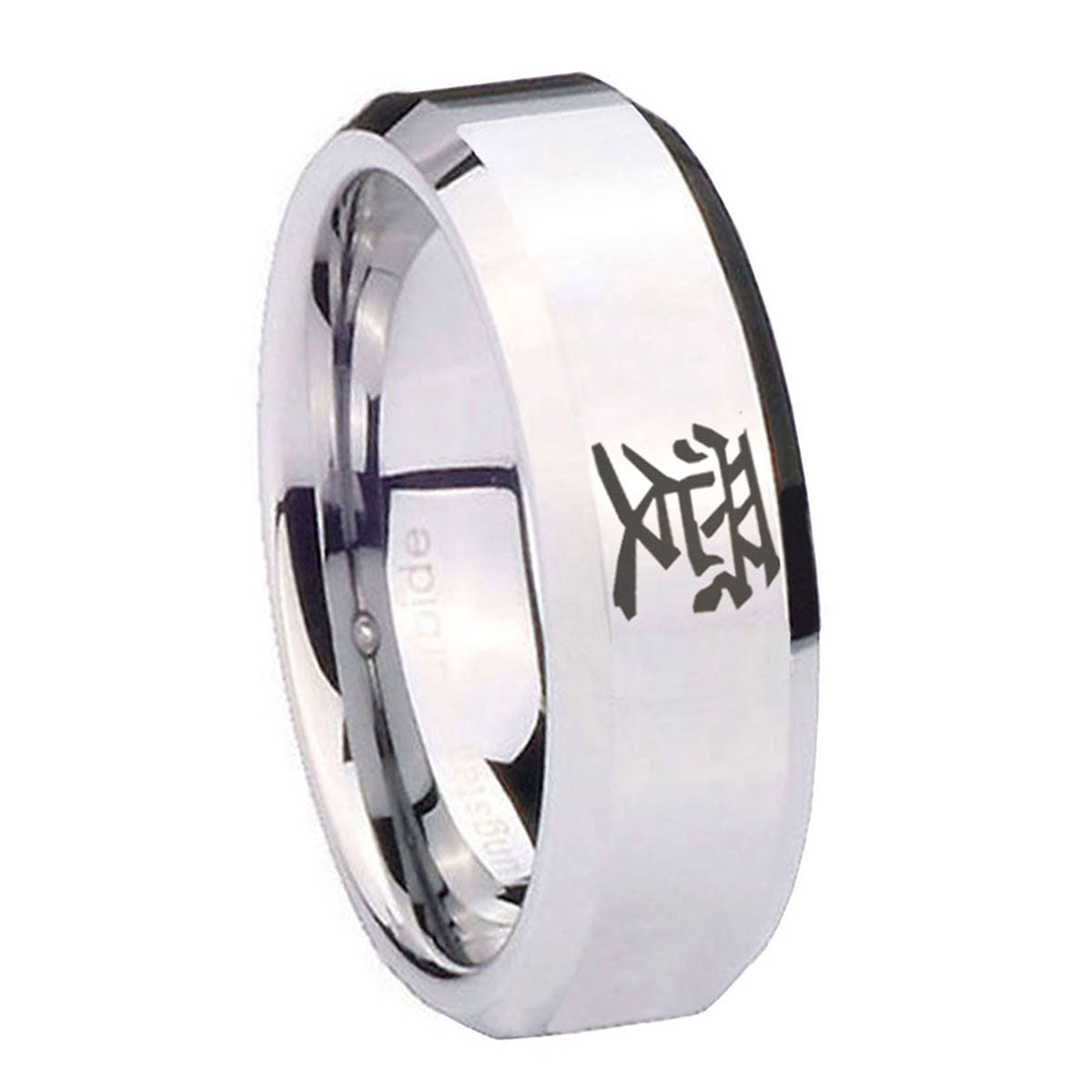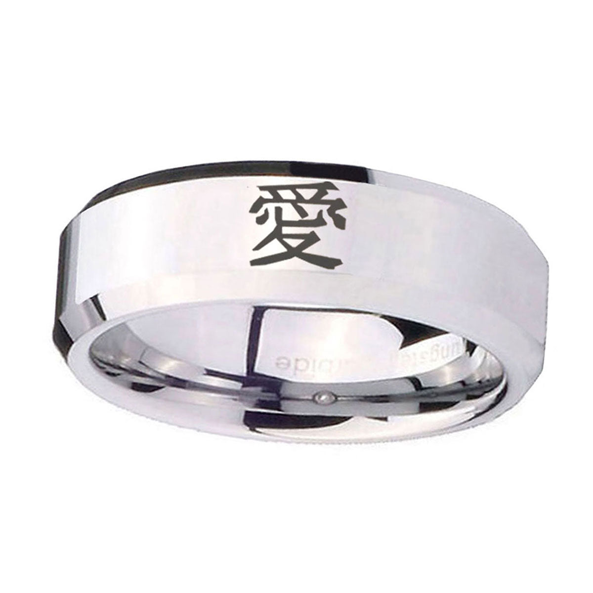 Introuding 5, 8mm Kanji Love Beveled Edges Silver Tungsten Carbide Men's Wedding Band . Offer in both 5mm and 8mm band width polished silver fnished from size 4 to 14