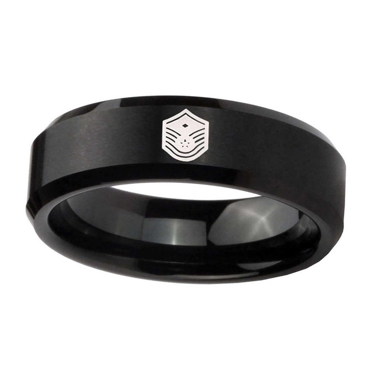 Style the 10mm Chief Master Sergeant Vector Beveled Edges Brush Black Tungsten Mens Ring. This brushed black tungsten ring with Chief Master Sergeant design is perfect for veterans.