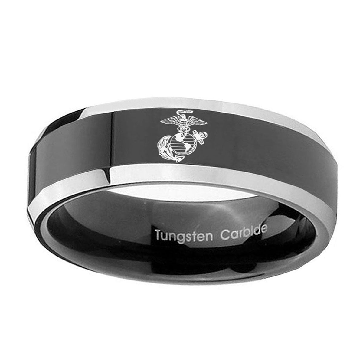Introuding 5, 8mm Marine Beveled Edges Glossy Black 2 Tone Tungsten Mens Engagement Ring . Offer in both 5mm and 8mm band width shiny black pated two tone finished from size 4 to 14