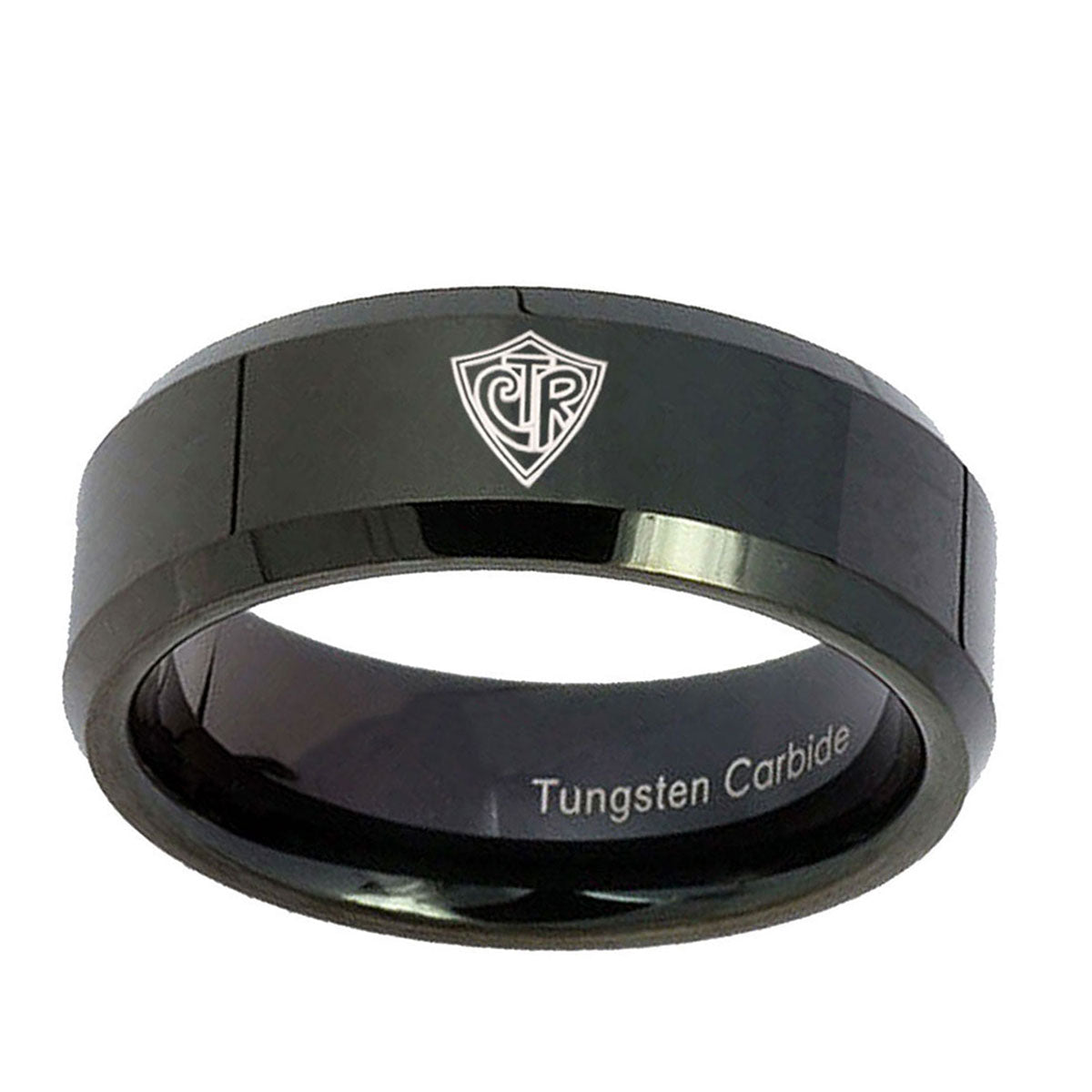 Introuding 5, 8mm CTR Beveled Edges Black Tungsten Carbide Mens Anniversary Ring . Offer in both 5mm and 8mm band width polished black plated fnished from size 4 to 14