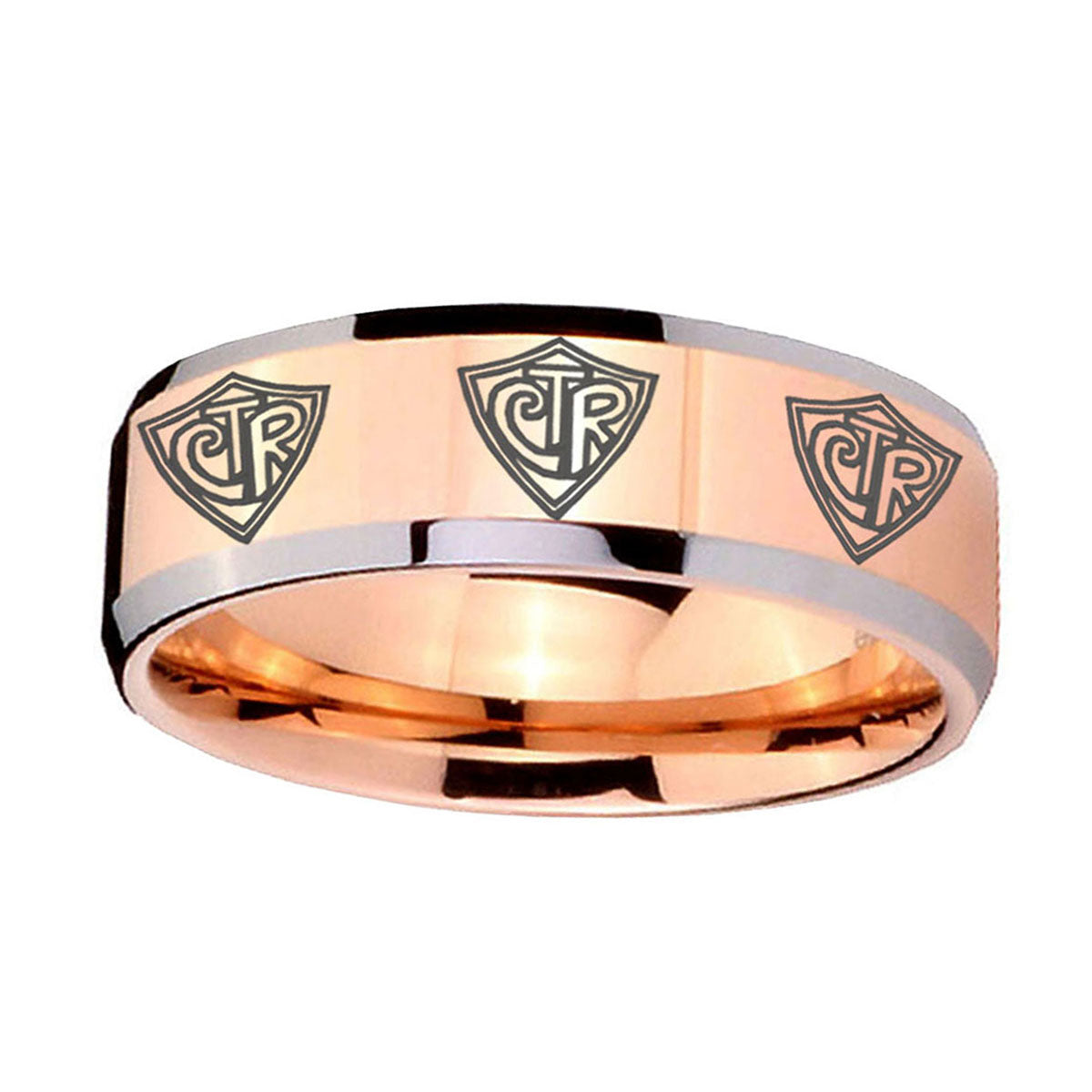 Personalize the 10mm Multiple CTR Beveled Edges Rose Gold Tungsten Carbide Engraved Ring. This rose gold tungsten ring with Multiple CTR design is perfect for custom engravings.