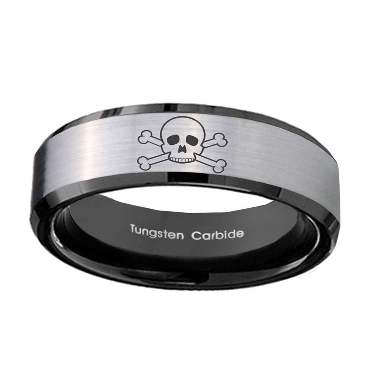 Style the 10mm Skull Beveled Edges Brushed Silver Black Tungsten Carbide Bands Ring. This silver and black tungsten ring with Skull design is perfect for men.