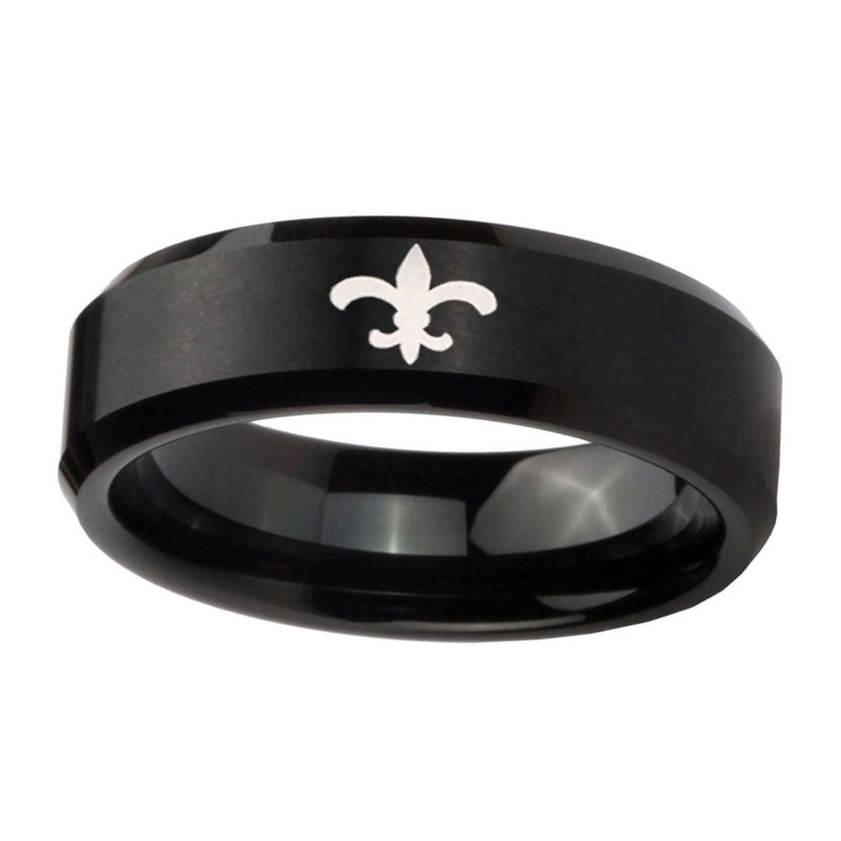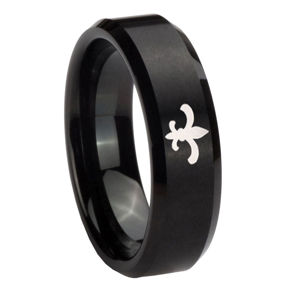 Introuding 5, 8mm Fleur De Lis Beveled Edges Brush Black Tungsten Carbide Mens Wedding Band . Offer in both 5mm and 8mm band width brushed black plated fnished from size 4 to 14