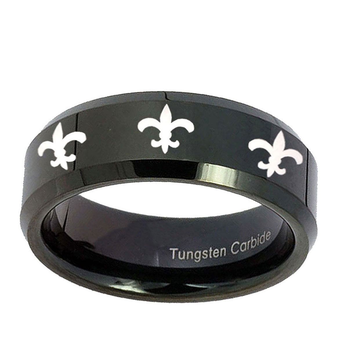 Propose with the 10mm Multiple Fleur De Lis Beveled Edges Black Tungsten Mens Engagement Band. This black tungsten ring with Multiple Fleur De Lis design is ideal for engagements.