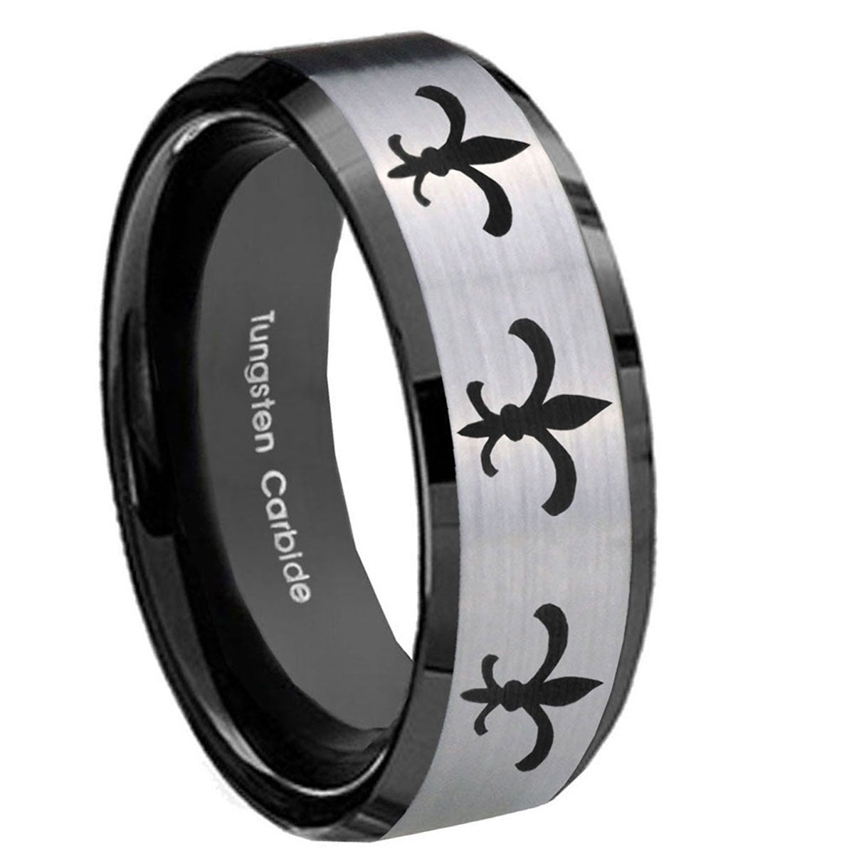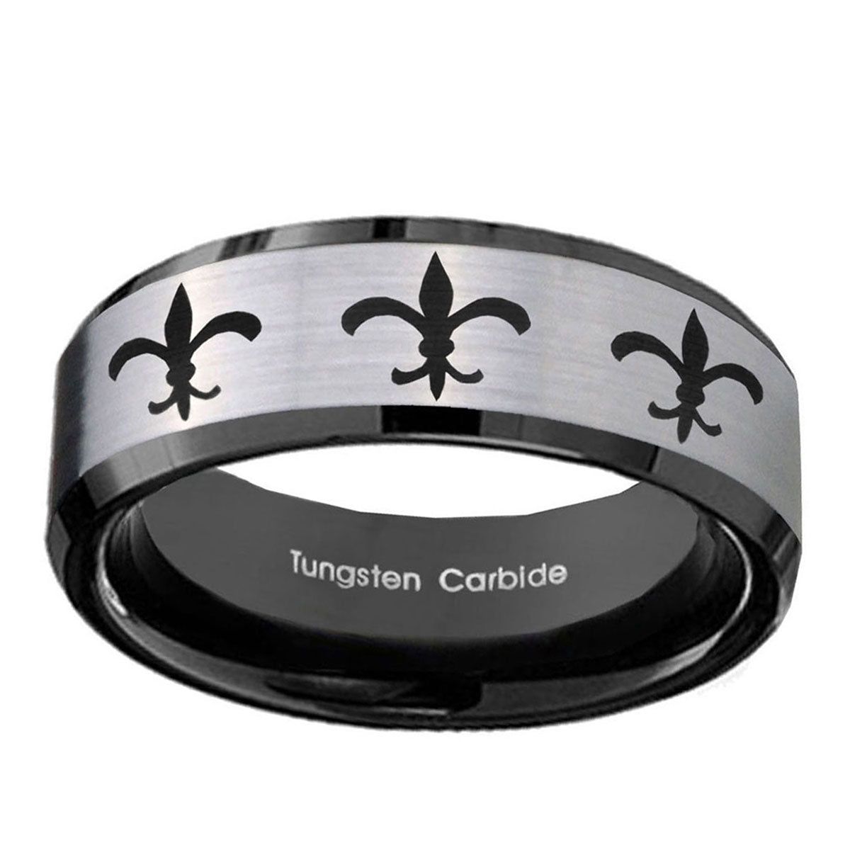 Celebrate with the 10mm Multiple Fleur De Lis Beveled Brushed Silver Black Tungsten Bands Ring. This silver and black tungsten ring with Multiple Fleur De Lis design is perfect for weddings.