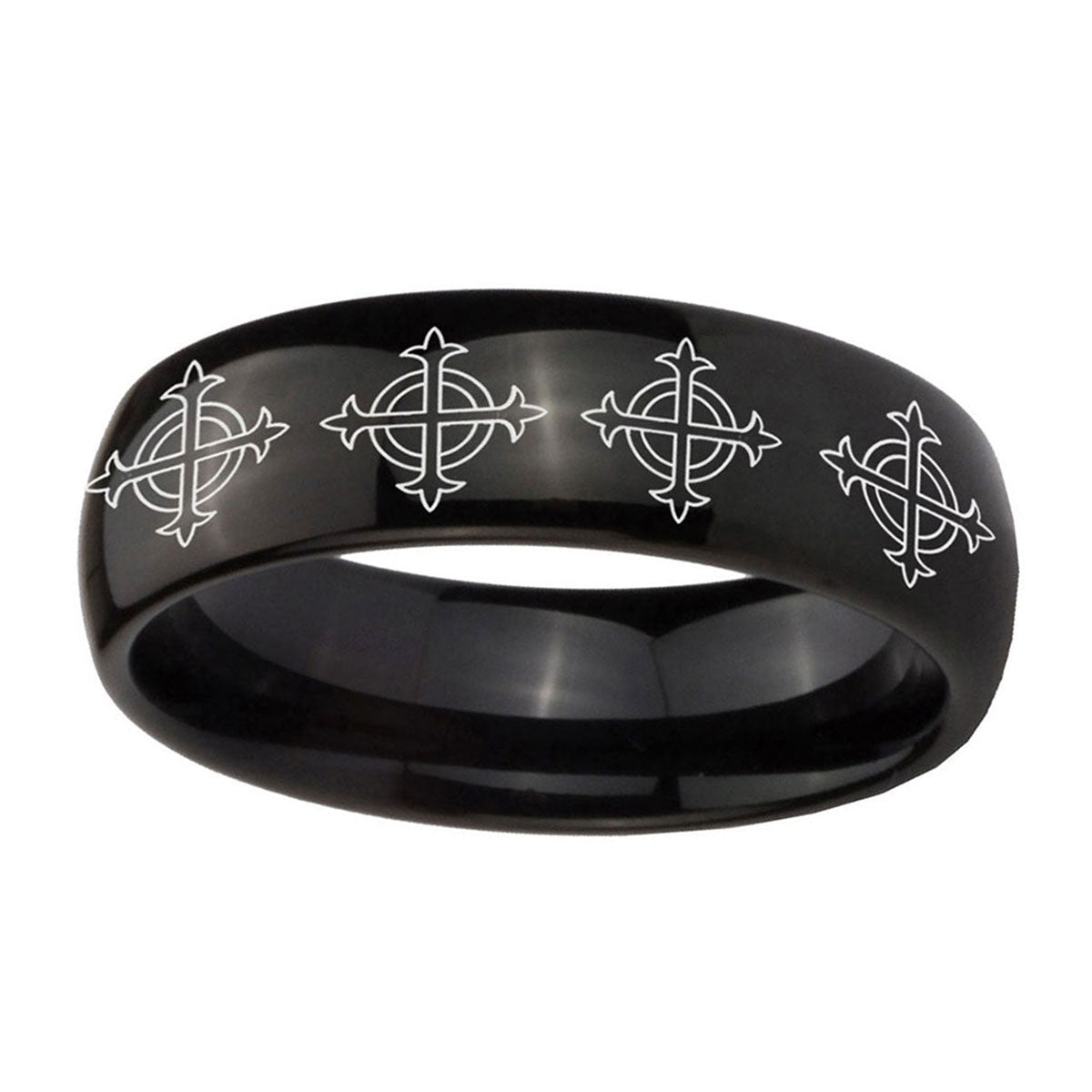 Celebrate with the 10mm Multiple Crosses Dome Black Tungsten Carbide Men's Wedding Band. This dome-shaped black tungsten ring with Multiple Crosses design is perfect for weddings.