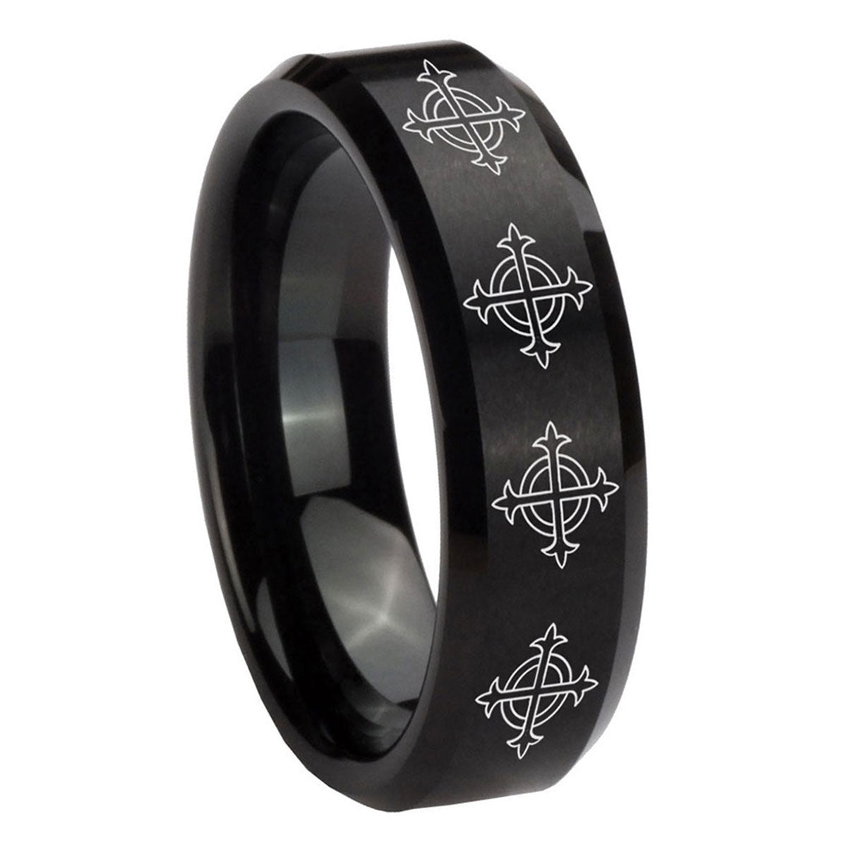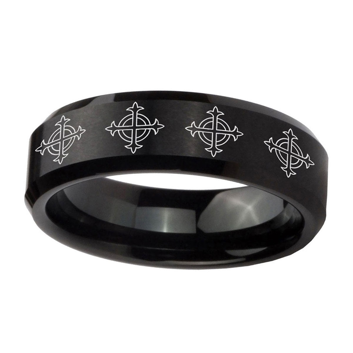 Celebrate with the 10mm Multiple Crosses Beveled Edges Brush Black Tungsten Mens Wedding Ring. This brushed black tungsten ring with Multiple Crosses design is perfect for weddings.