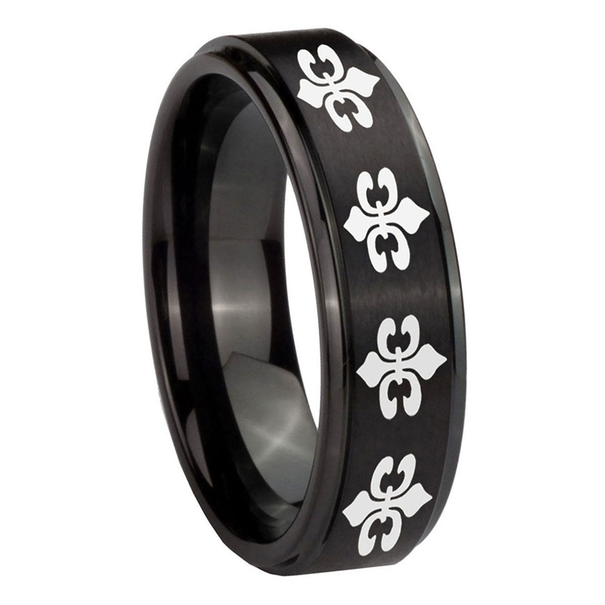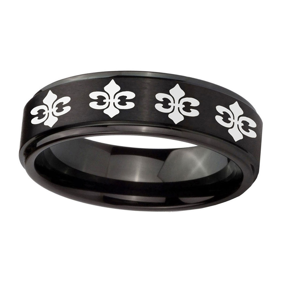 Make a promise with the 10mm Multiple Fleur De Lis Step Edges Brush Black Tungsten Men's Promise Rings. This brushed black ring with step edges and Multiple Fleur De Lis design is ideal for commitments.