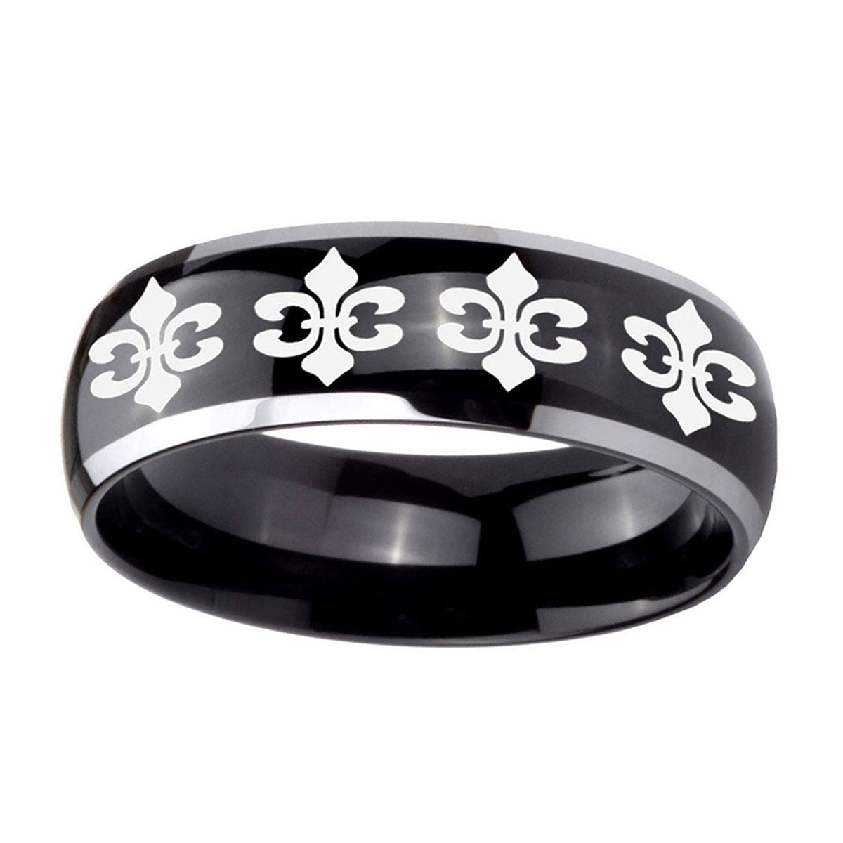 5, 8mm Multiple Fleur De Lis Dome Glossy Black 2 Tone Tungsten Engraved Ring