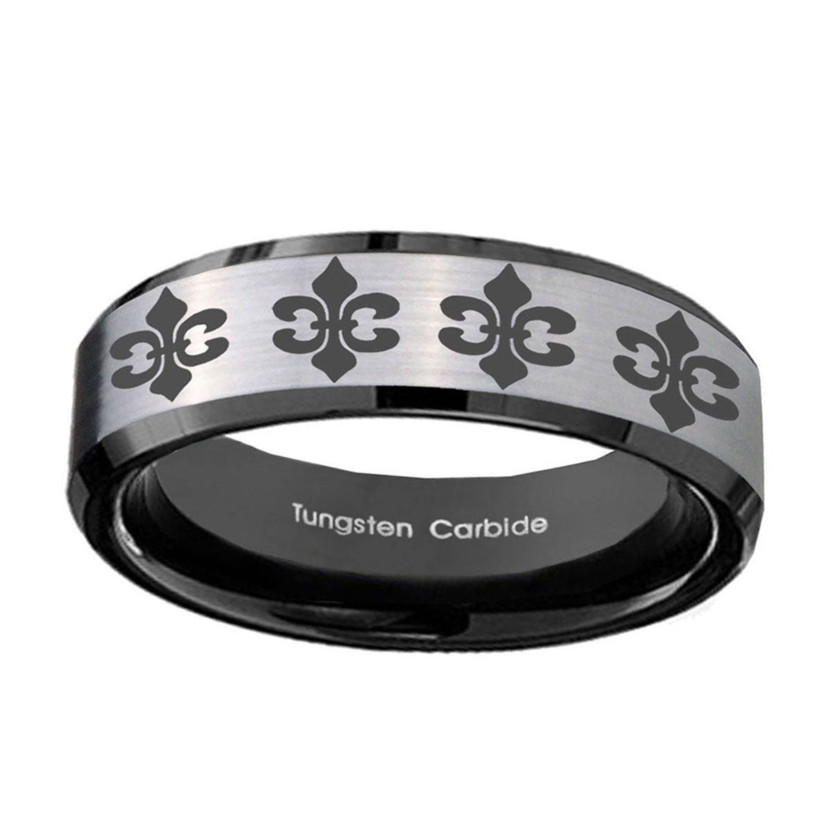 10mm Multiple Fleur De Lis Beveled Brushed Silver Black Tungsten Engraved Ring