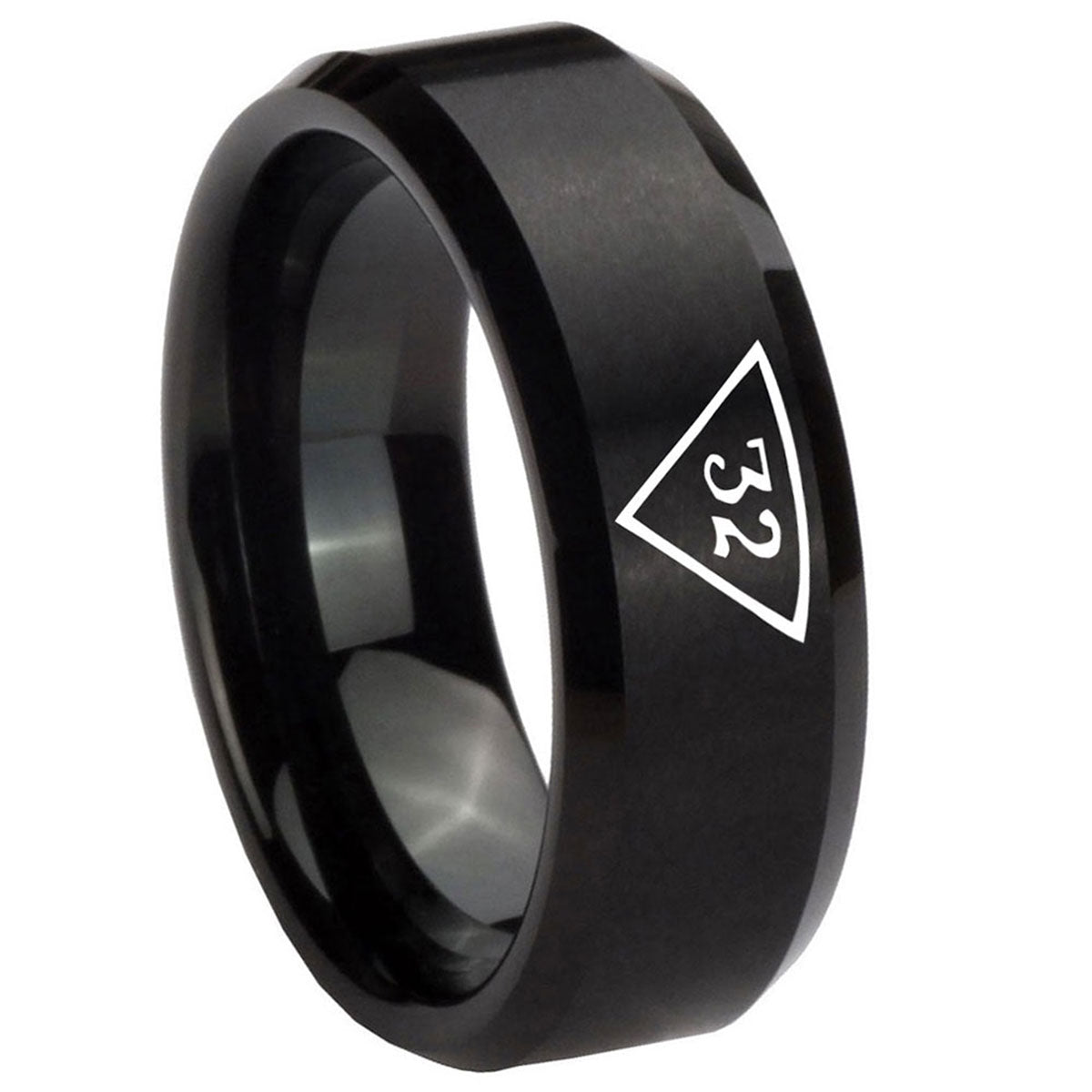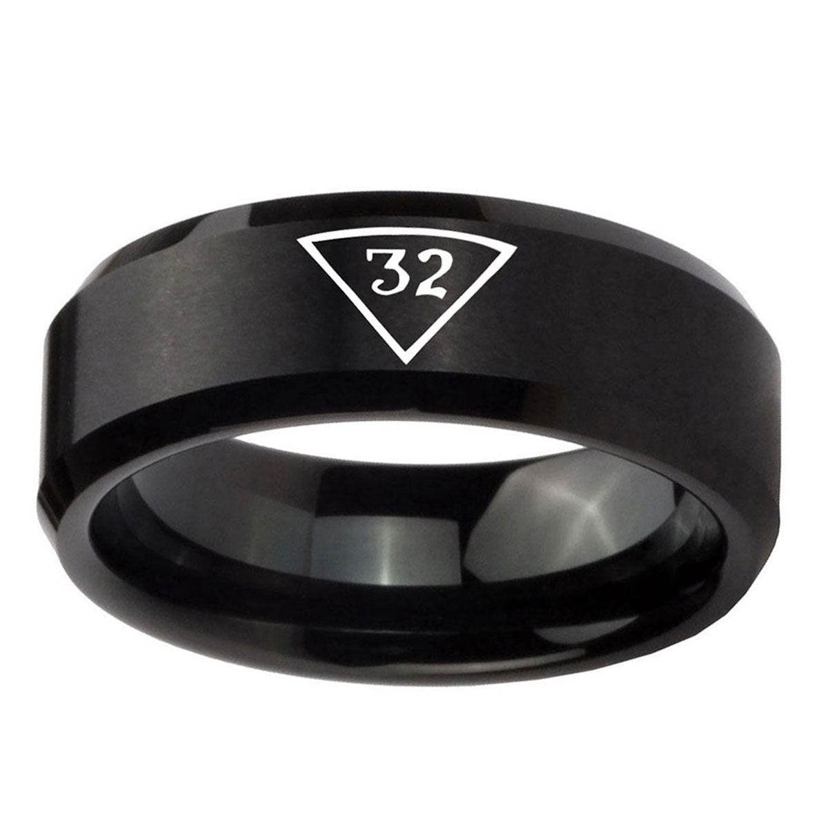 Celebrate with the 10mm Masonic 32 Triangle Freemason Beveled Edges Brush Black Tungsten Carbide Wedding Band Ring. This brushed black tungsten ring with Masonic design is perfect for weddings.