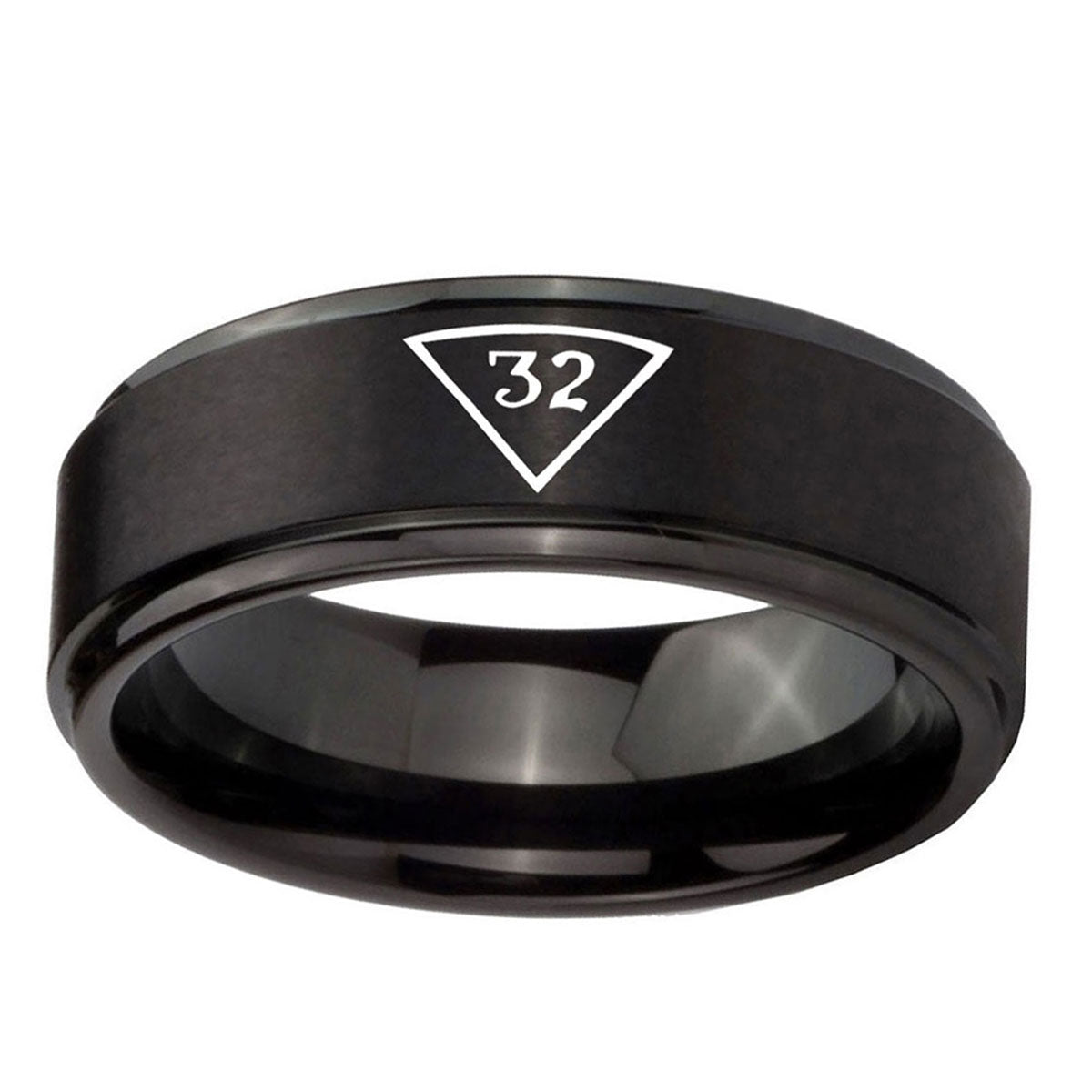 10mm Masonic 32 Triangle Freemason Step Edges Brush Black Tungsten Carbide Mens Engagement Band