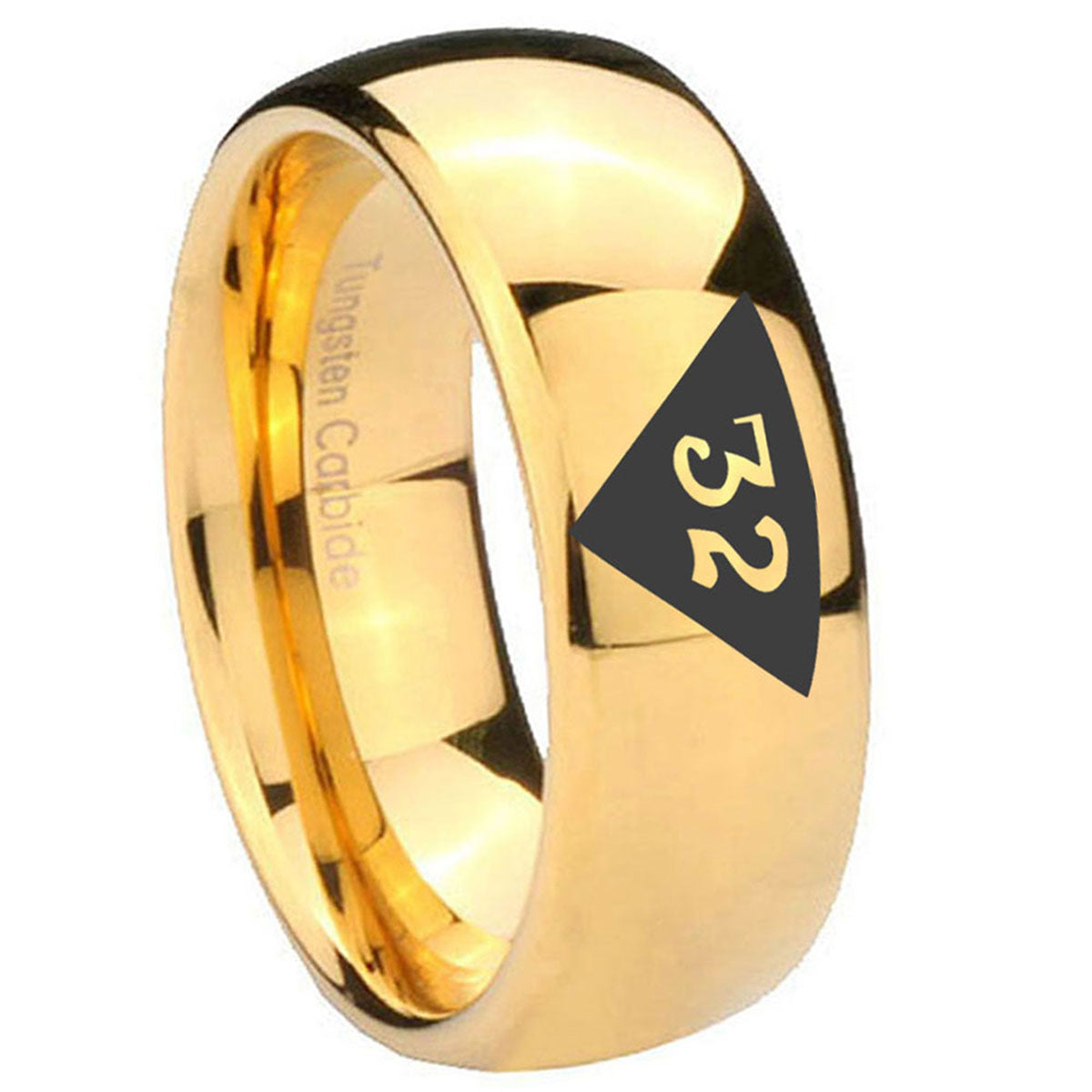 Propose with the 10mm Masonic 32 Triangle Design Freemason Dome Gold Tungsten Carbide Men's Engagement Band. This gold-finished tungsten ring with Masonic design is ideal for engagements.
