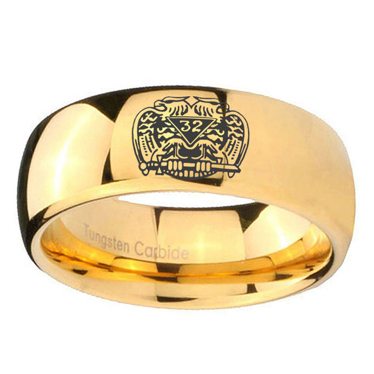 Propose with the 10mm Masonic 32 Degree Freemason Dome Gold Tungsten Carbide Men's Engagement Band. This gold-finished tungsten ring with Masonic 32 Degree Freemason design is ideal for engagements.