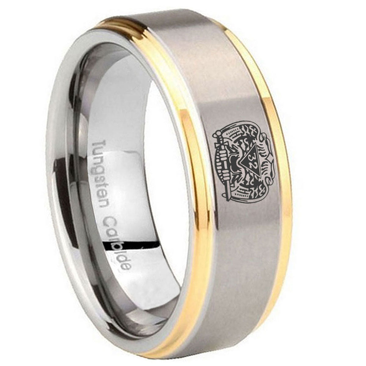 Style the 10mm Masonic 32 Degree Freemason Step Edges Gold 2 Tone Tungsten Carbide Mens Ring. This gold and 2-tone tungsten ring with Masonic 32 Degree Freemason design is perfect for men.