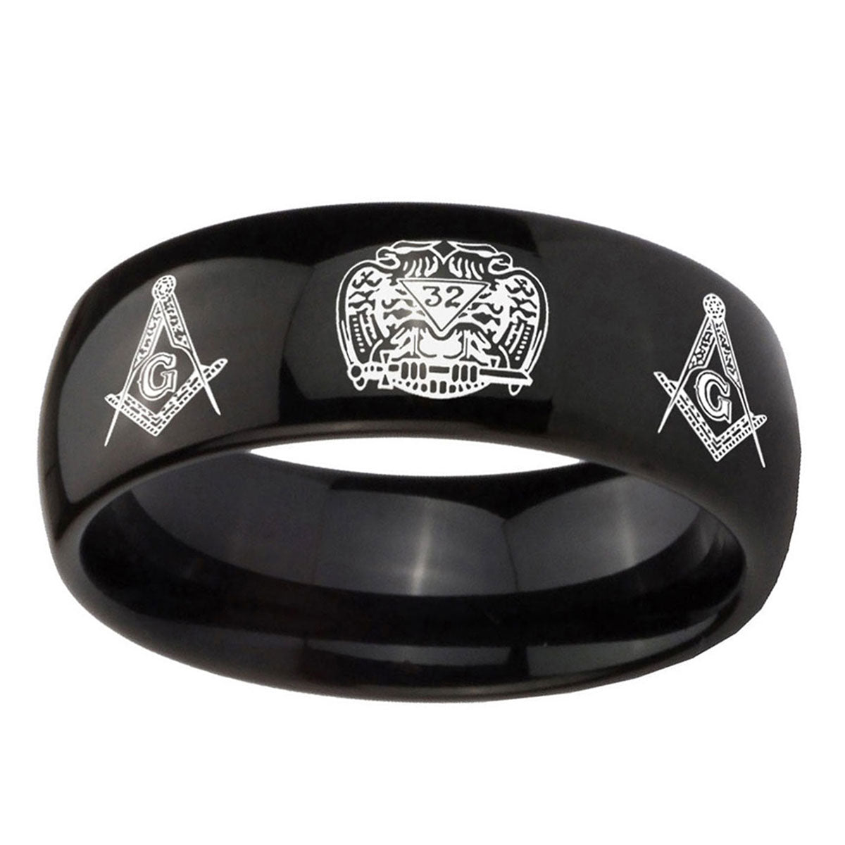 Propose with the 10mm Masonic 32 Design Dome Black Tungsten Carbide Mens Engagement Band. This dome-shaped black tungsten ring with Masonic 32 Design is ideal for engagements.