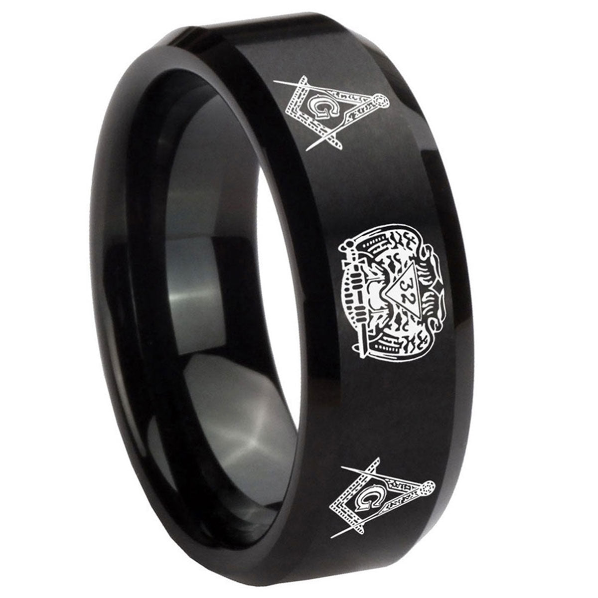 10mm Masonic 32 Design Beveled Edges Brush Black Tungsten Mens Engagement Band