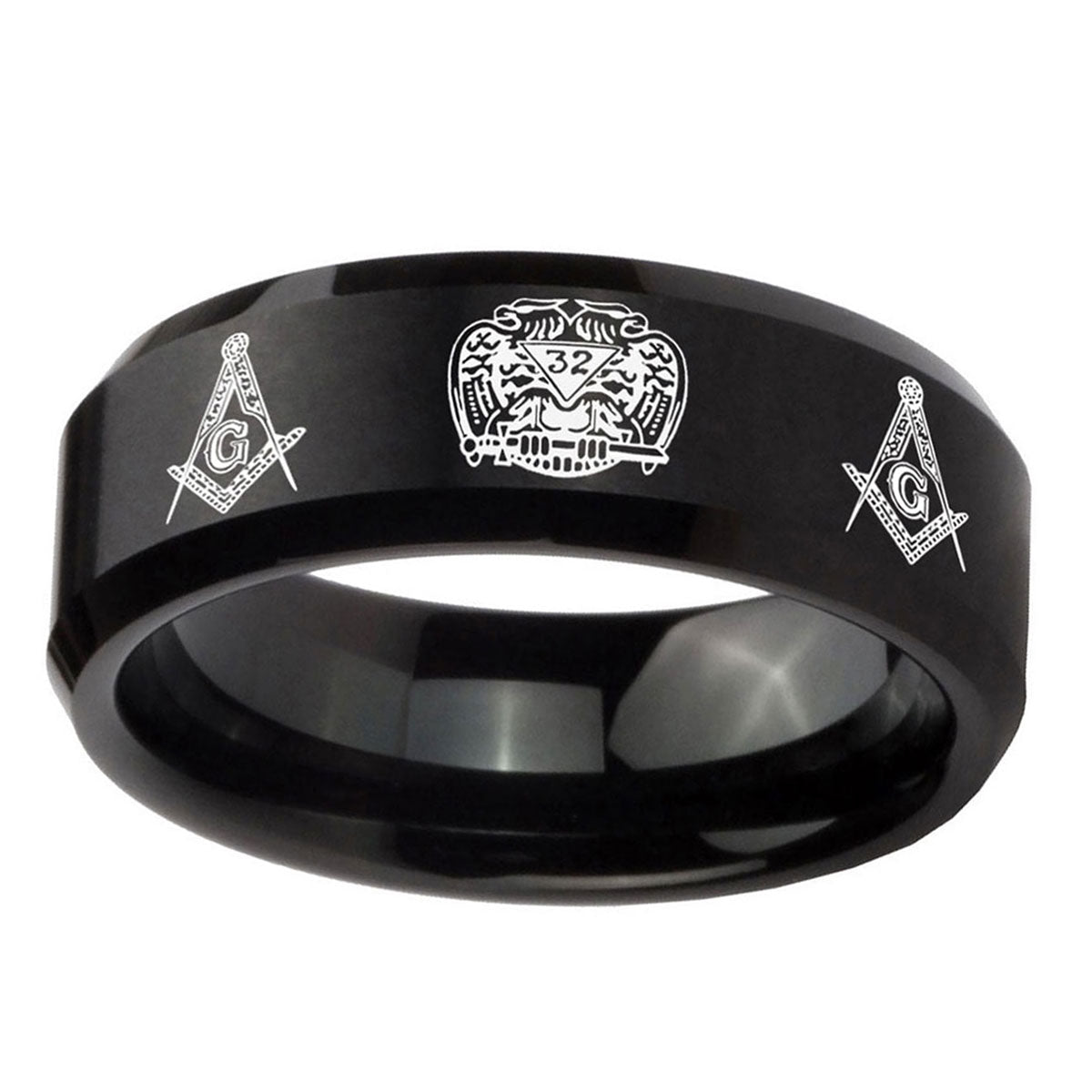 Propose with the 10mm Masonic 32 Design Beveled Edges Brush Black Tungsten Mens Engagement Band. This brushed black tungsten ring with Masonic 32 Design is ideal for engagements.