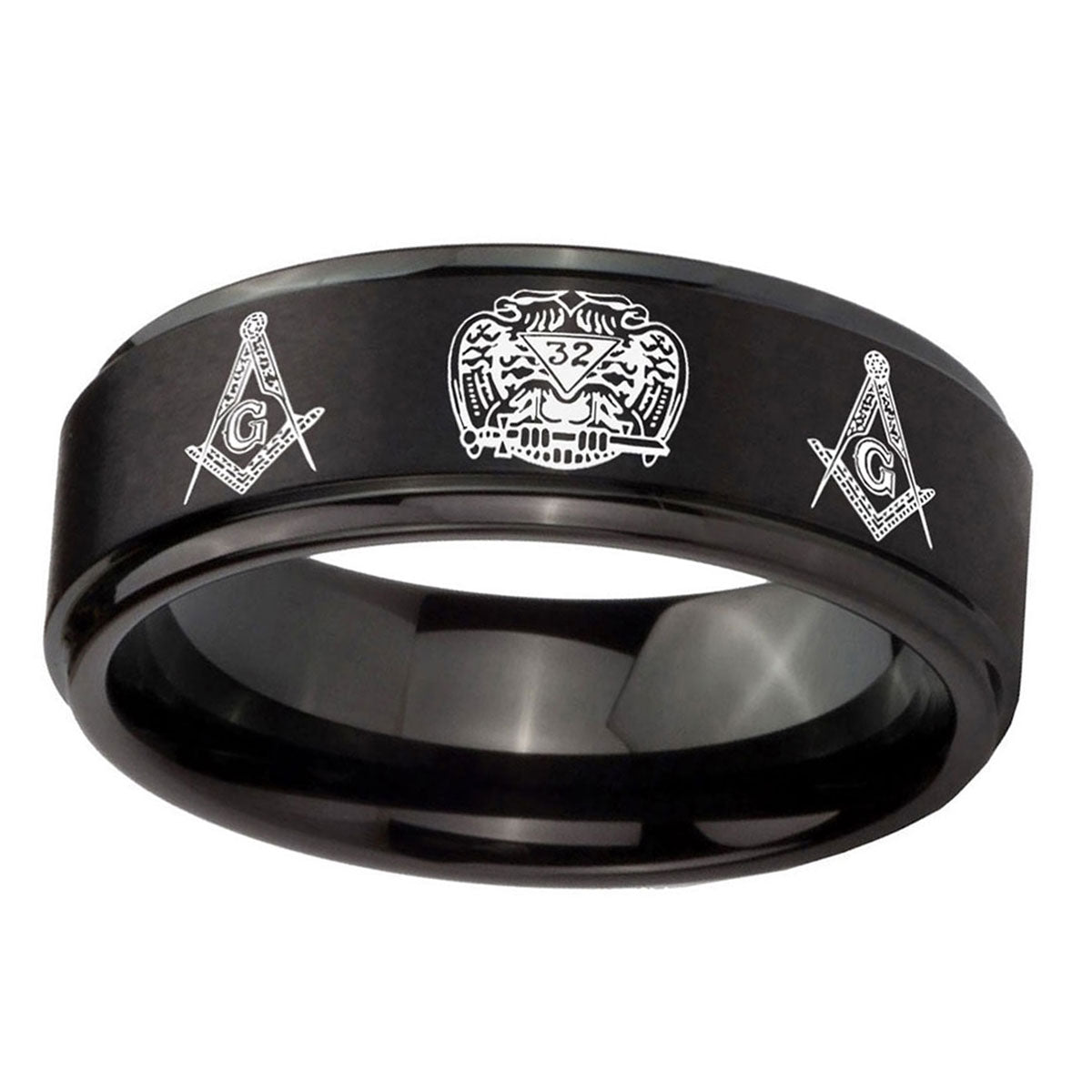 10mm Masonic 32 Design Step Edges Brush Black Tungsten Mens Engagement Ring