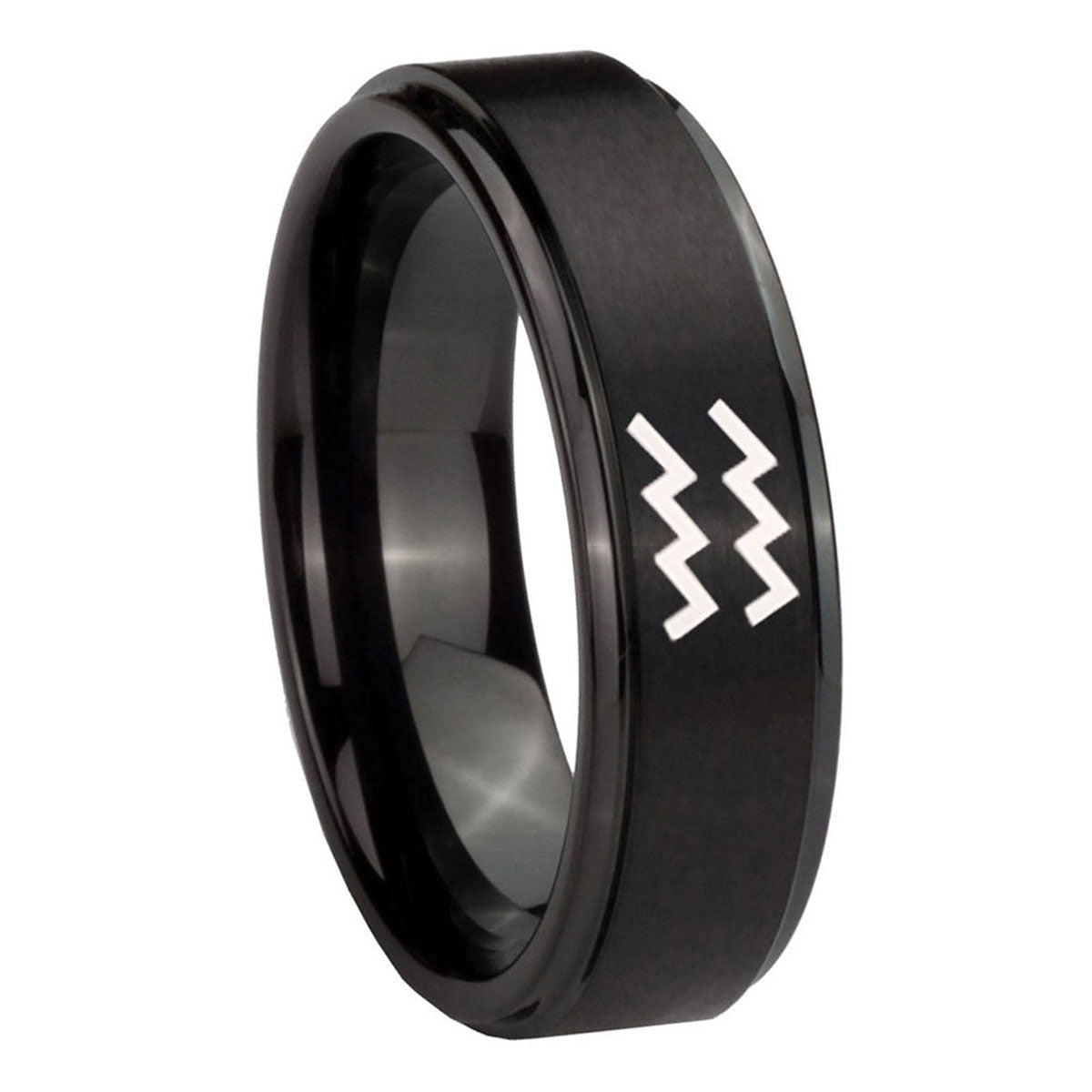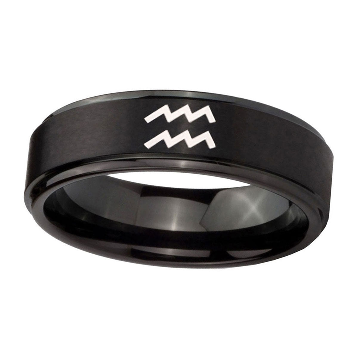 Customize the 10mm Aquarius Horoscope Step Edges Brush Black Tungsten Custom Ring for Men. This brushed black ring with step edges and Aquarius design is ideal for personalization.