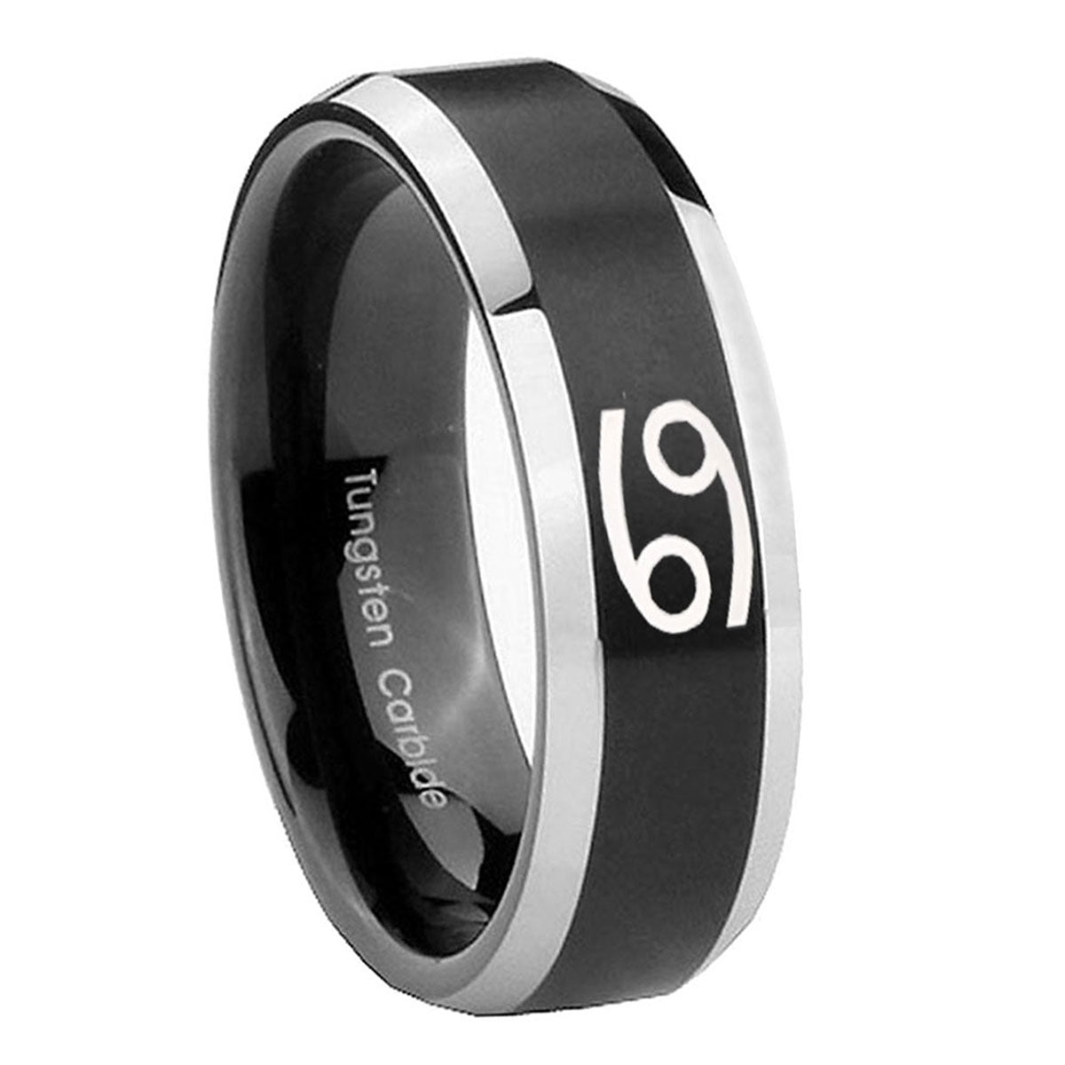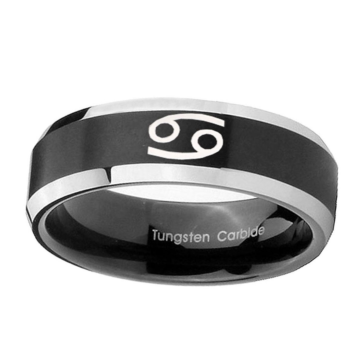 Embrace your sign with the 10mm Cancer Horoscope Beveled Brush Black 2 Tone Tungsten Wedding Band Mens. This brushed black and 2-tone tungsten ring with Cancer design is perfect for weddings.