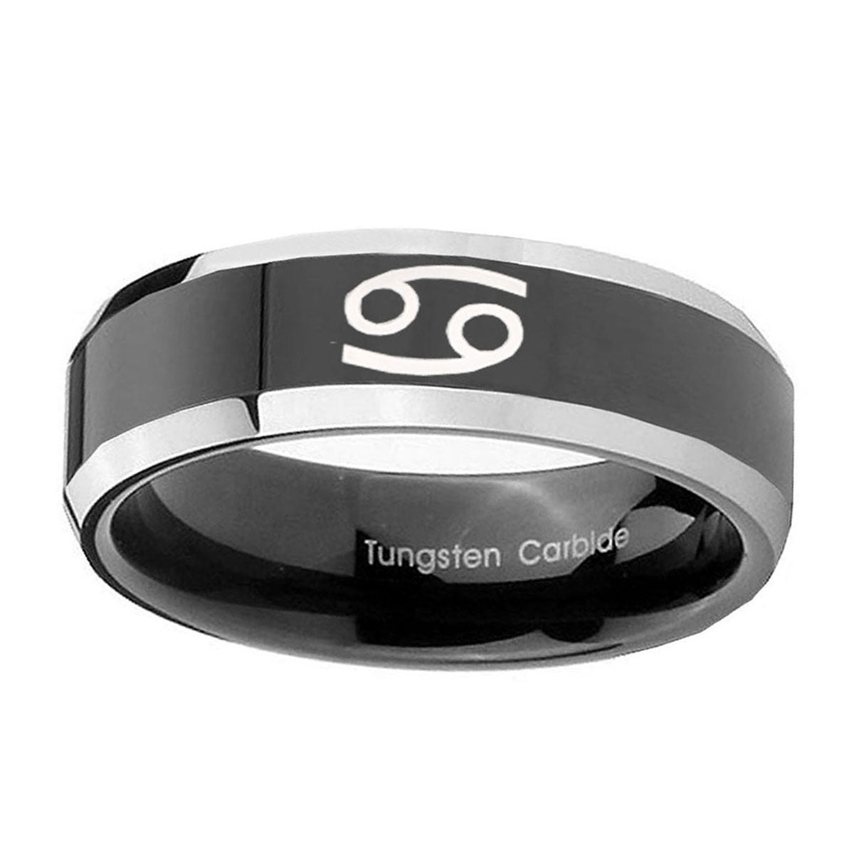 Propose with the 10mm Cancer Horoscope Beveled Glossy Black 2 Tone Tungsten Men's Engagement Ring. This glossy black and 2-tone tungsten ring with Cancer design is ideal for engagements.