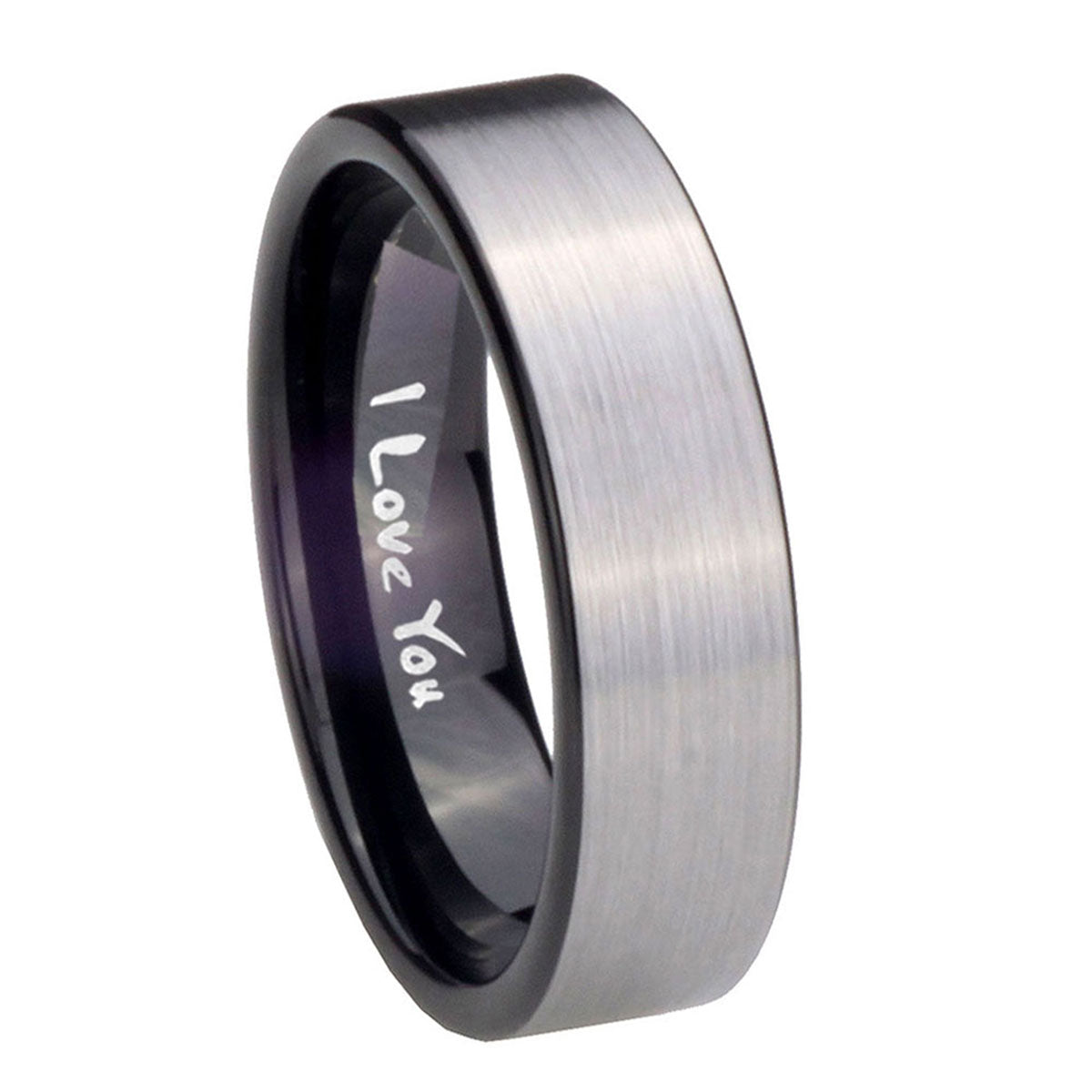 Introuding 6, 8mm I Love You Pipe Cut Brushed Silver Tungsten Carbide Wedding Engagement Ring . Offer in both 5mm and 8mm band width brushed silver and black plated fnished from size 4 to 14
