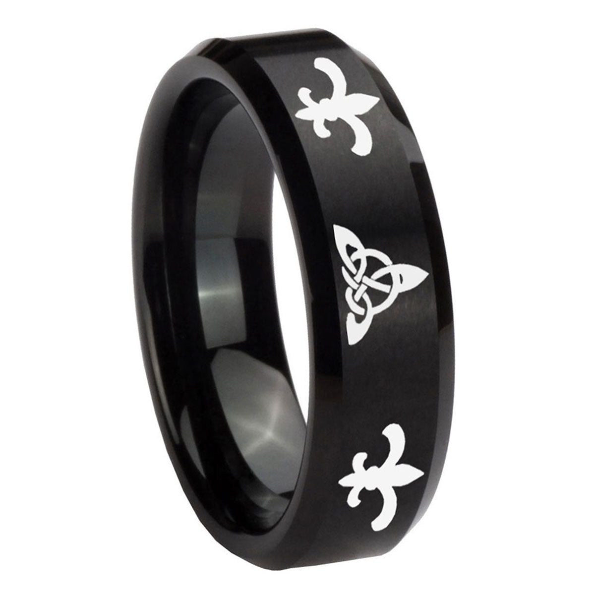 Celebrate with the 10mm Celtic Triangle Fleur De Lis Beveled Brush Black Tungsten Rings for Men. This brushed black tungsten ring with Celtic triangle fleur de lis design is perfect for men.